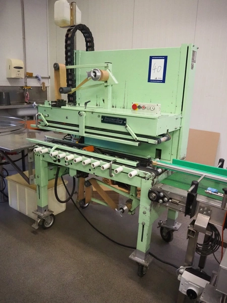 Bedo-Verpackungsmachinen box closing machine, model: VA 300, serial number: 4569, year of construction: 1990, 380 V, 3 Ph, 50 Hz, 2.5 A, adjustable clearance, dimensions: 1250 mm x 400 mm x 2050 mm.
