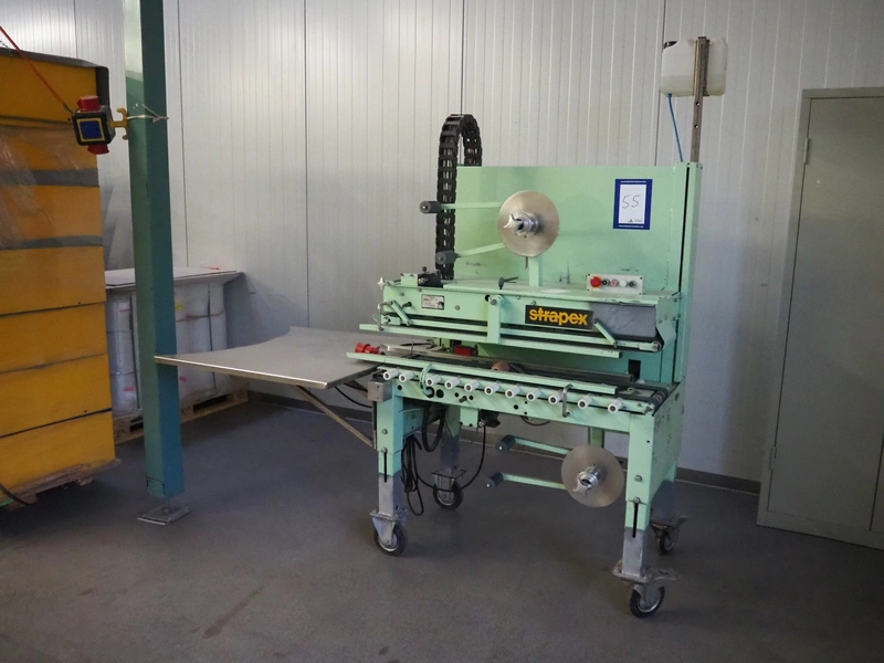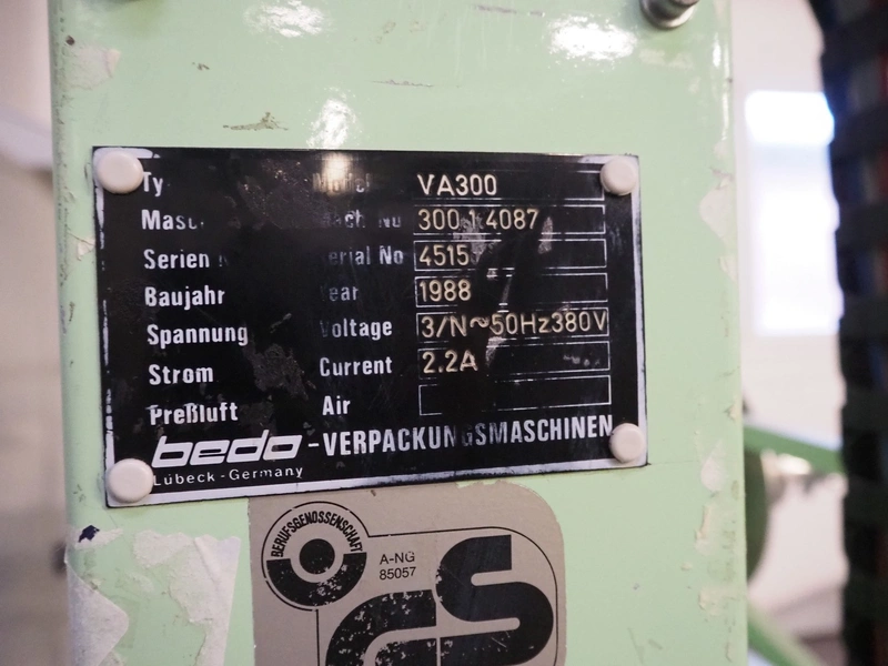 Bedo-Verpackungsmachinen box closing machine, model: VA 300, serial number: 4515, year of construction: 1988, 380 V, 3 Ph, 50 Hz, 2.2 A, adjustable clearance, dimensions: 2100 mm x 1000 mm x 2150 mm.