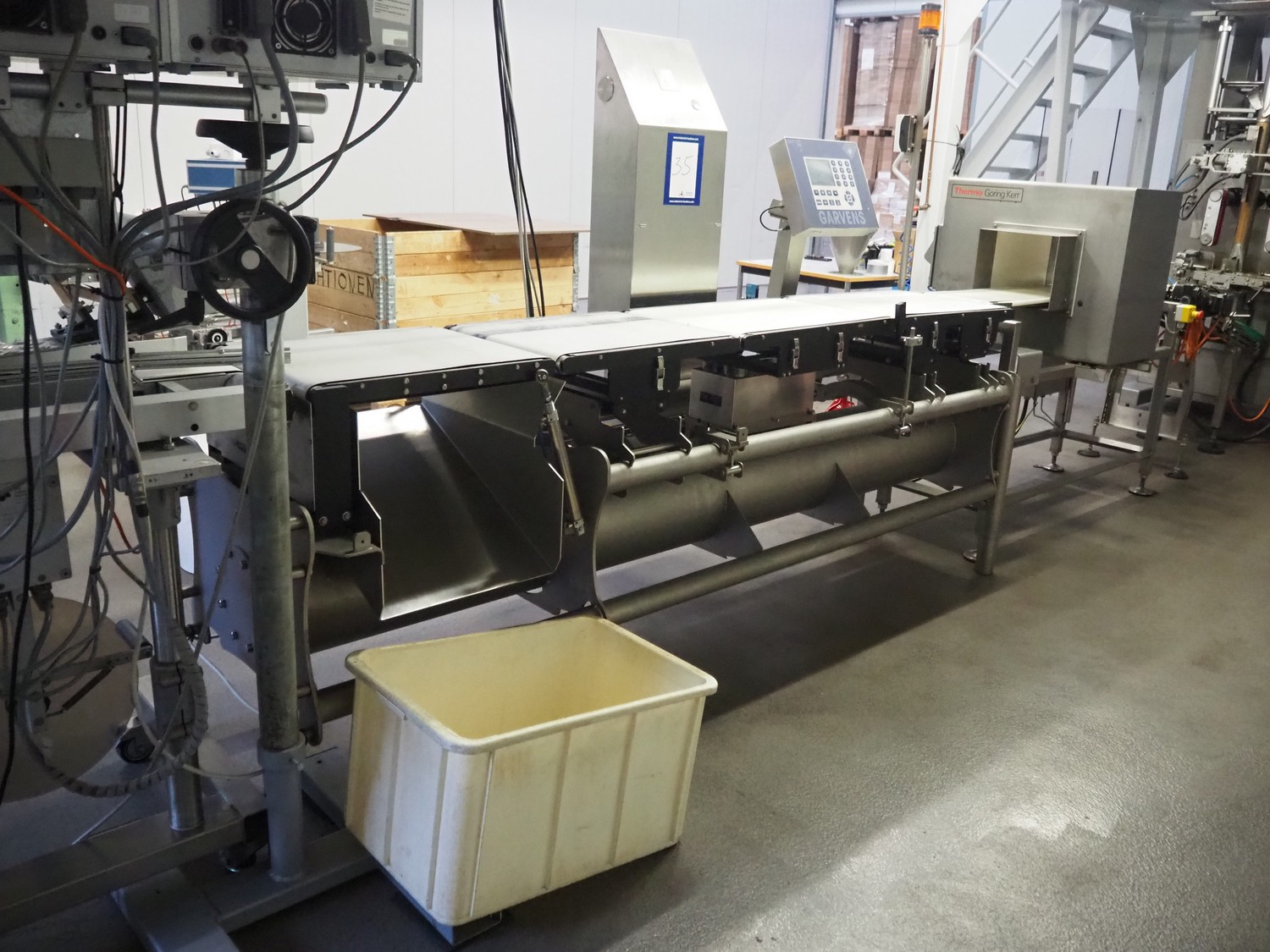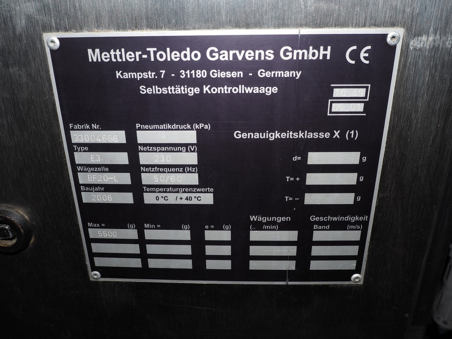 Mettler-Toledo Garvens GmbH checkweigher with rejector, type: E3, fabrication number: 33004666, year of construction: 2006, 230 V, 50/60 Hz, plastic belt, belt width: 400 mm, maximum weight: 5500 gram, total dimensions: 900 mm x 2400 mm x 1700 mm.