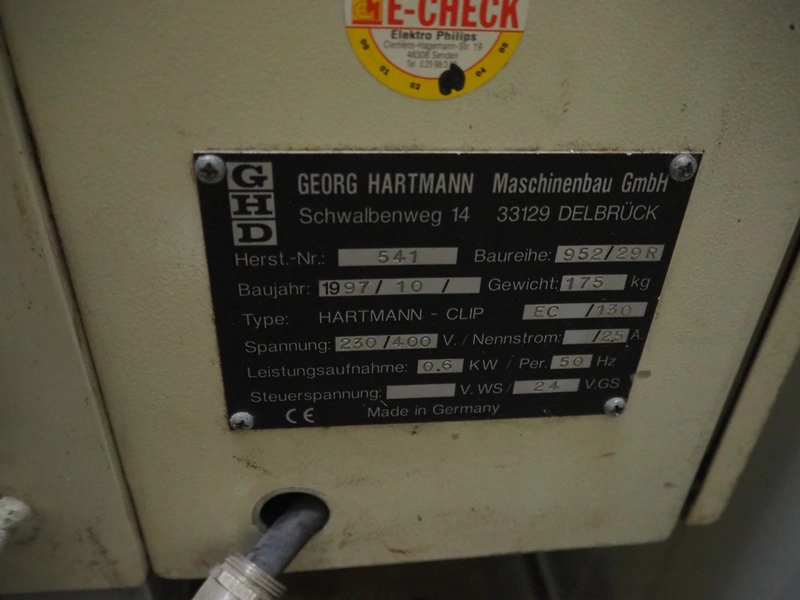 Georg Hartmann Maschinenbau GmbH bag clipper, type: HARTMANN-CLIP, serial number: 541, year of construction: 1997, 230/400 V, 50 Hz, weight: 175 kg, dimensions: 1400 mm x 1200 mm x 1100 mm.