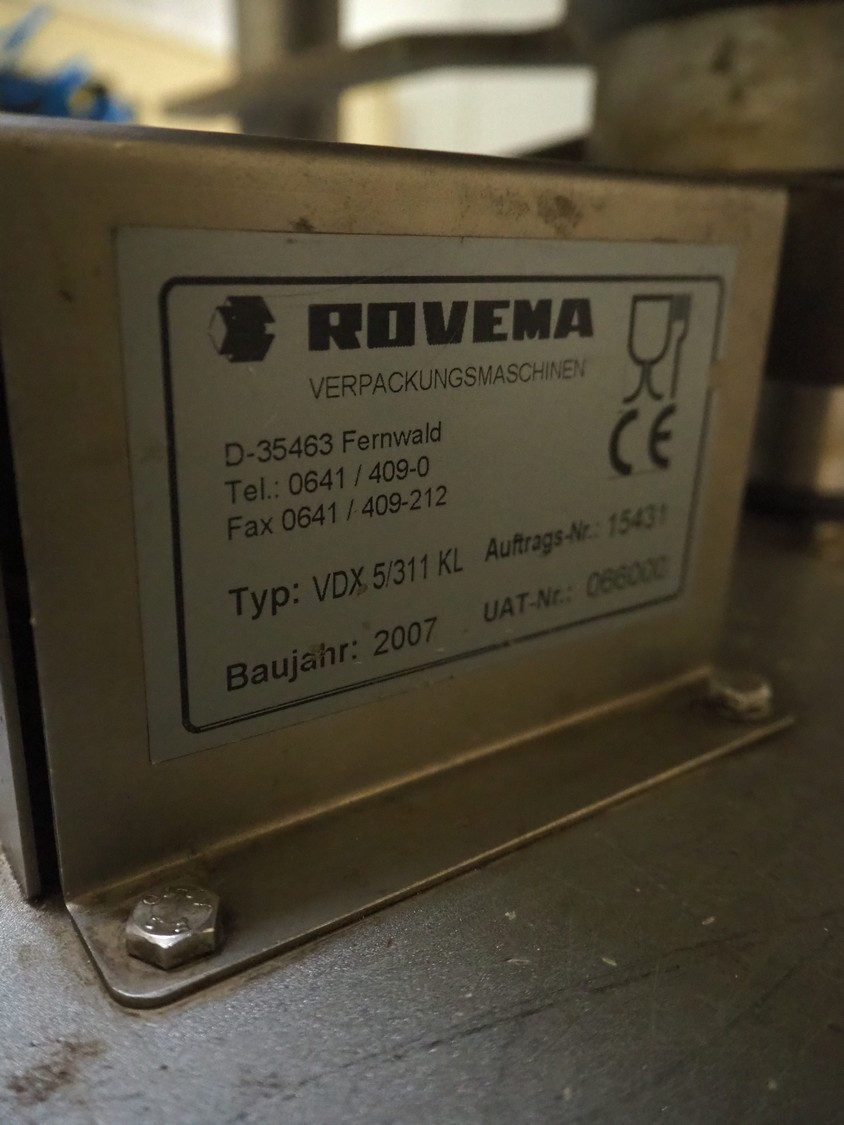 Rovema volumetric dosing machine, type: VDX 5/311 KL, year of construction: 2007, 8 heads, dimensions: 1600 mm x 1000 mm x 1550 mm.