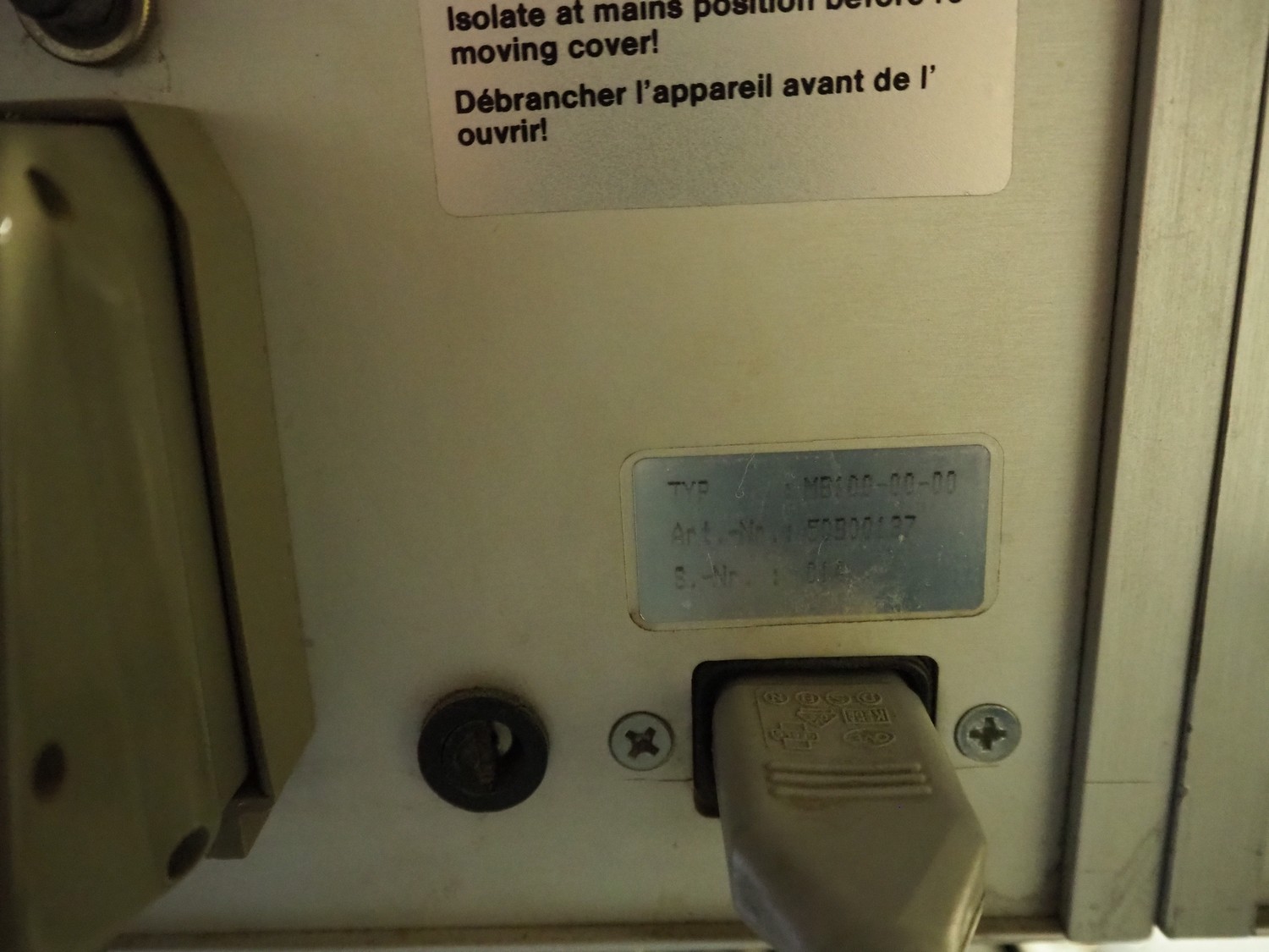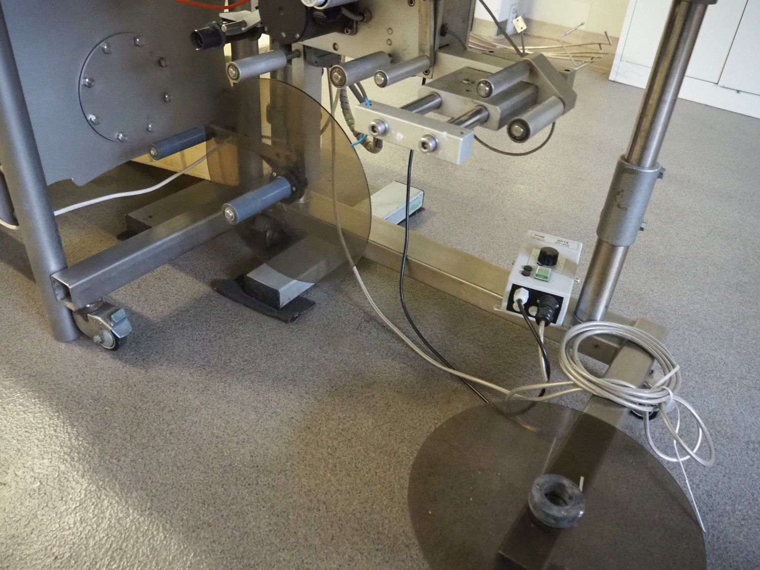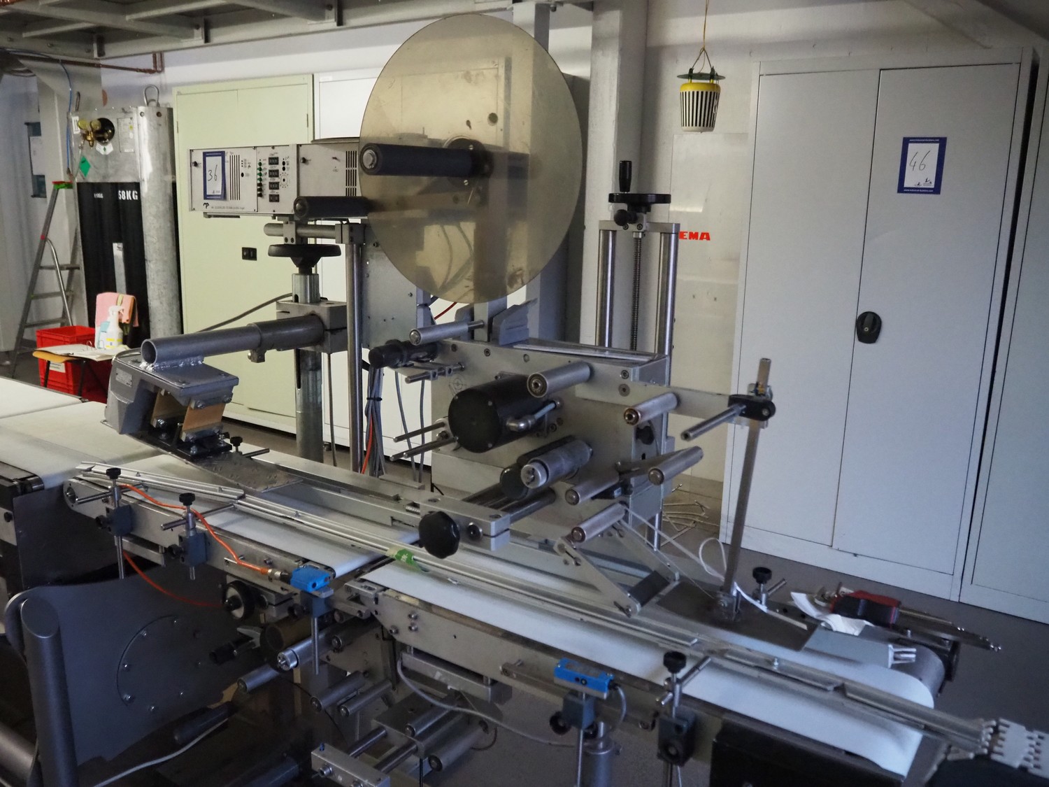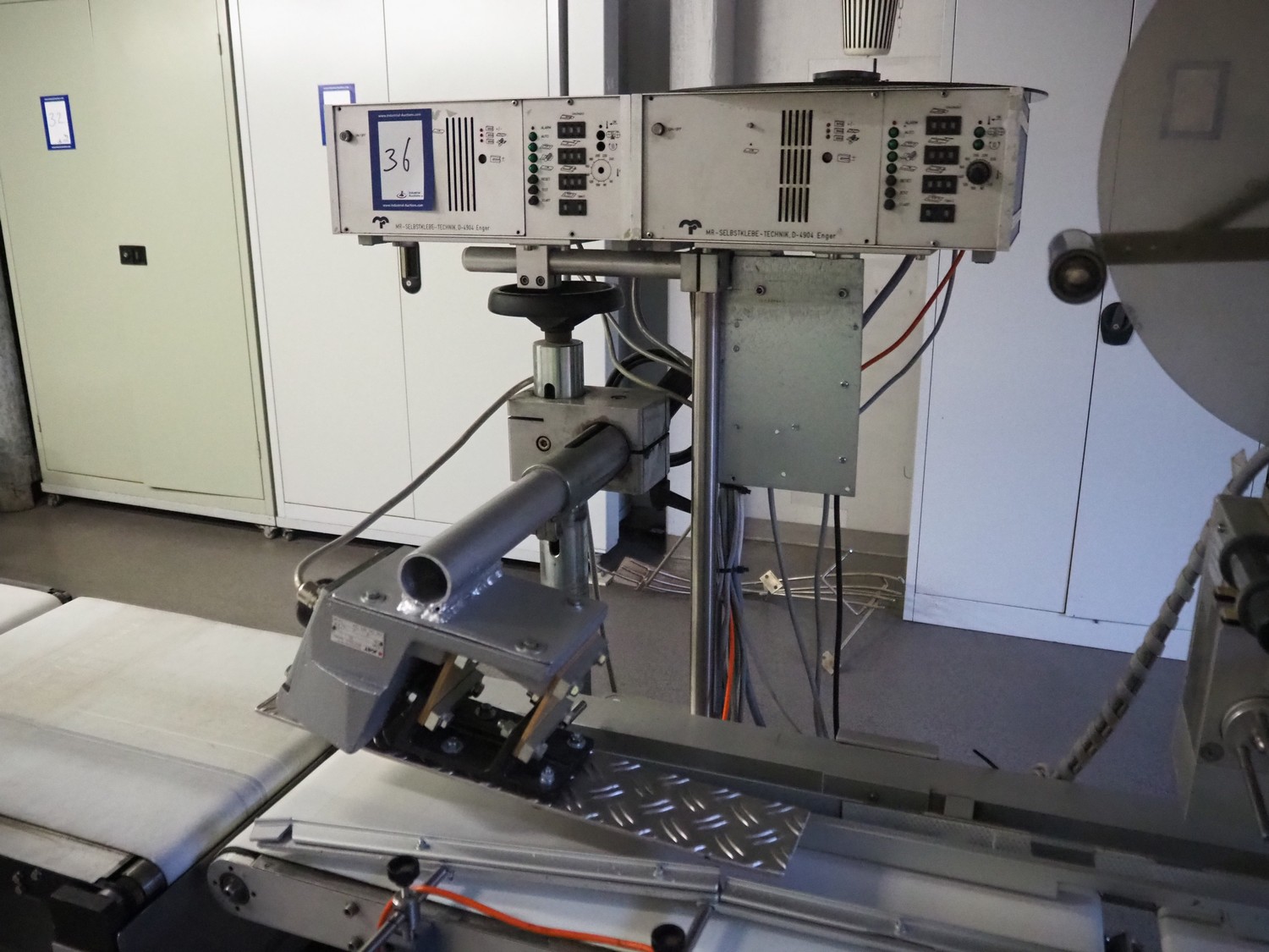 MR Etikettiertechnik labelling machine, model: MR 4272 BS TB 2019, machine number: 6755/89, 220 V, 50 Hz, plastic belt, belt width: 200 mm, total dimensions: 1600 mm x 800 mm x 1680 mm.