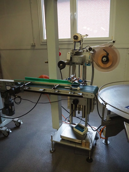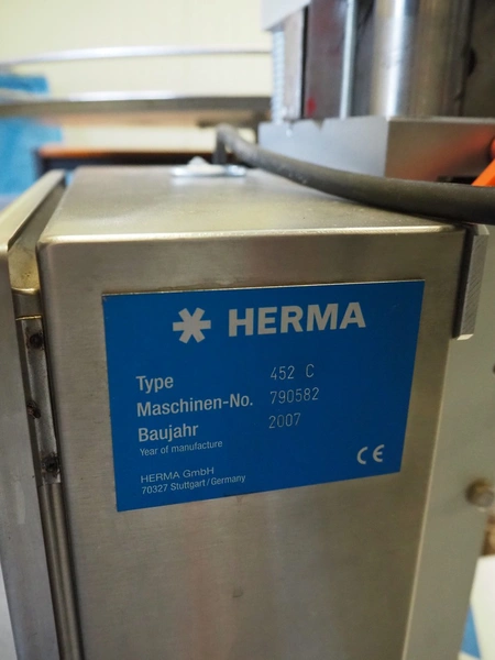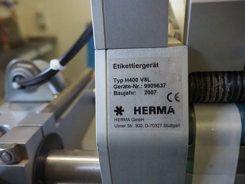 Herma labelling machine, type: H400 V8L, serial number: 9909637, year of construction: 2007, plastic belt, belt width: 245 mm, total dimensions: 1400 mm x 800 mm x 1600 mm.