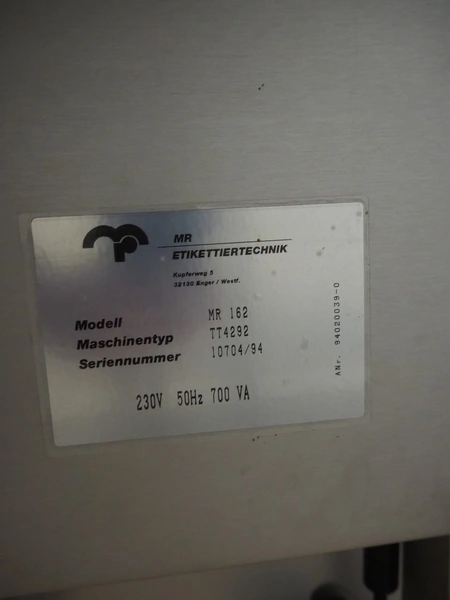 MR Etikettiertechnik labelling machine, model: MR 162, type: TT4292, serial nnumber: 10704/94, 230 V, 50 Hz, 700 VA.