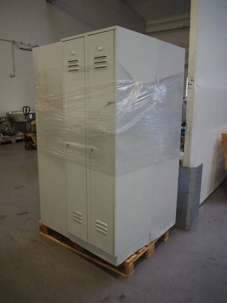 Pallet with 3 steel lockers, (2x) 2-doors, 3-doors, dimensions: (2x) 600 mm x 500 mm x 1800 mm, 500 mm x 900 mm x 1800 mm.