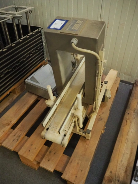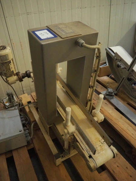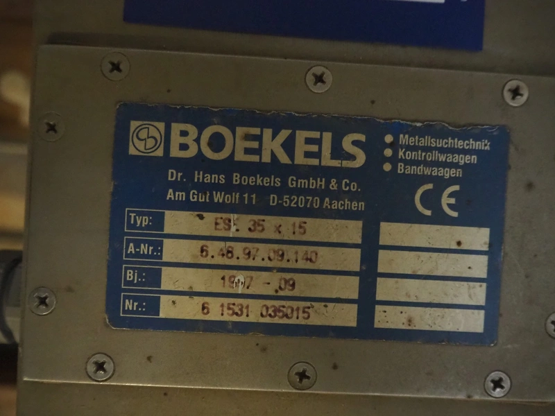 Pallet with Boekels metal detector, type: ESK 35X15, serial number: 6 1531 035015, year of construction: 1997, plastic belt, belt width: 100 mm, clearance: 150 mm x 325 mm, total dimensions: 930 mm x 450 mm x 800 mm.