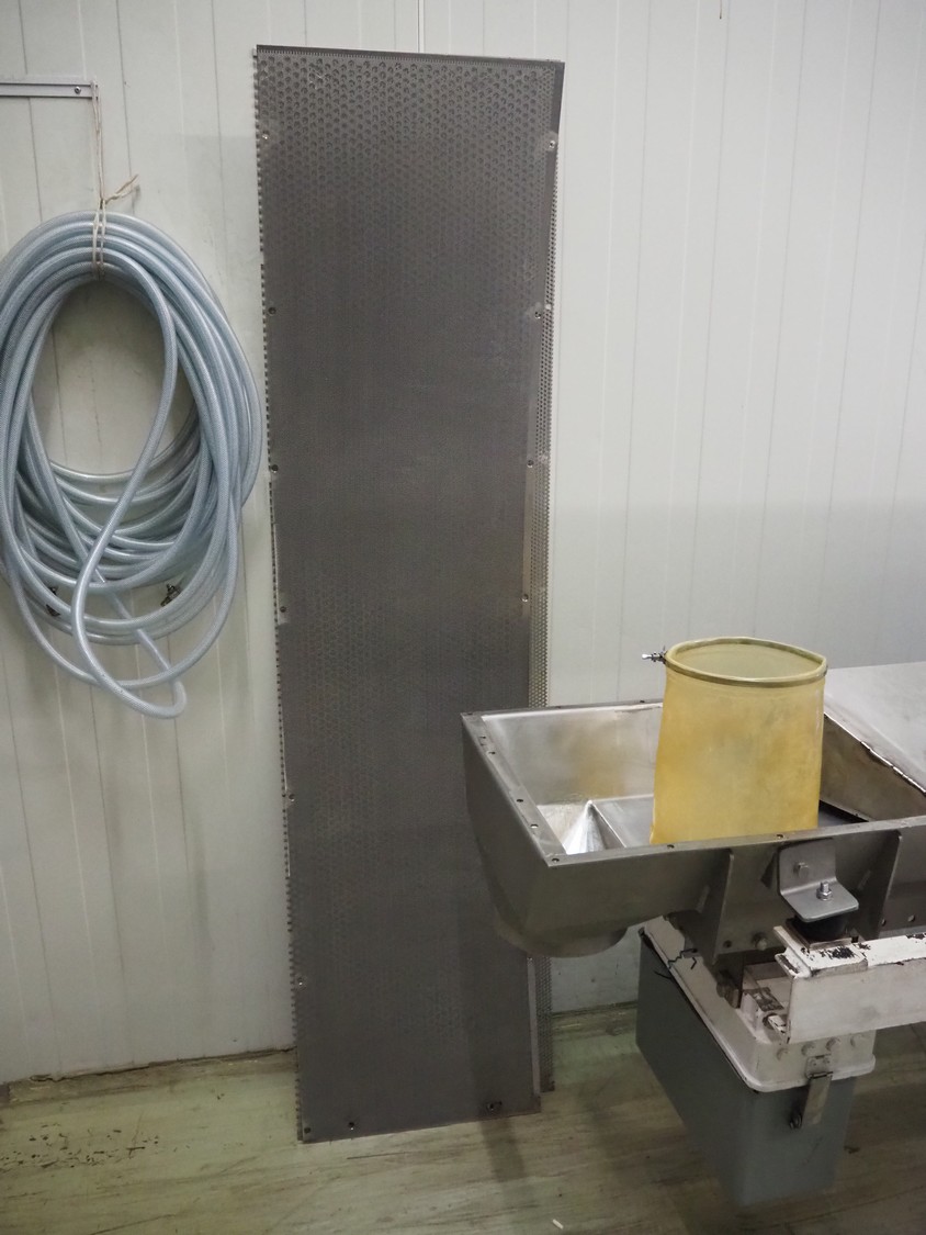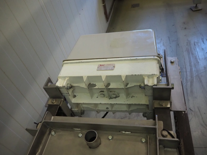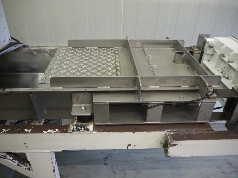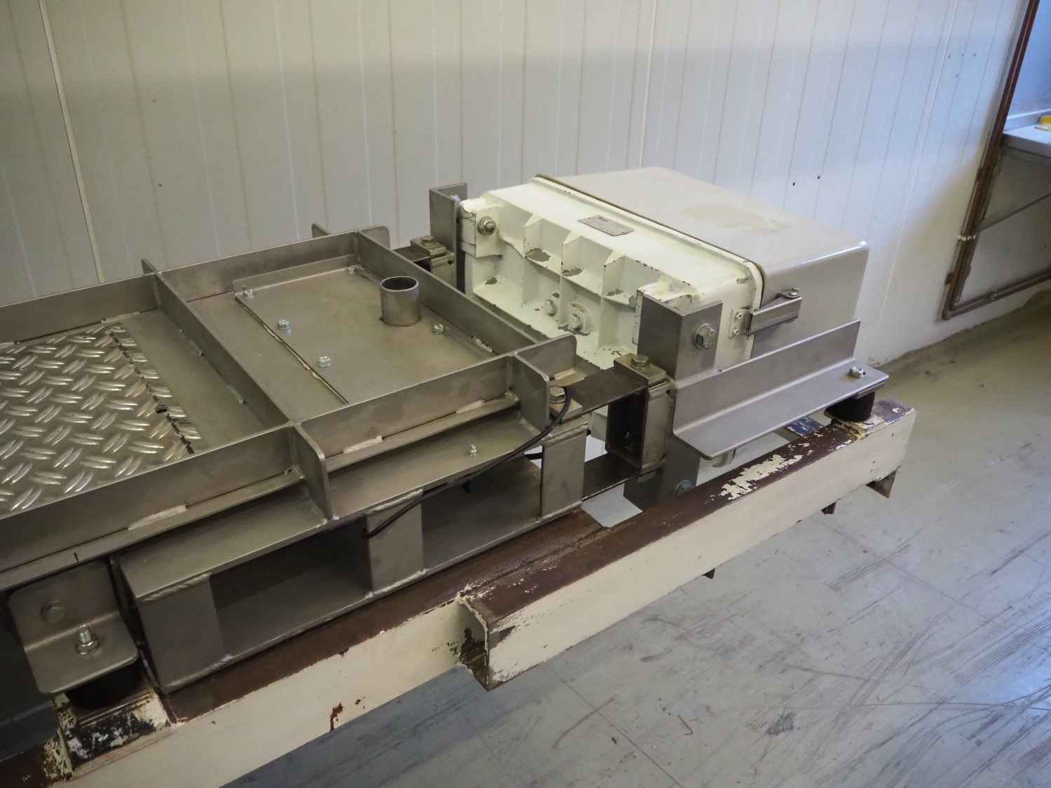 Vibrating sieve with 2 Stiletto electromagnetic vibrating motors, gutter width: 440 mm, diameter perforations: 10 mm, 5 mm and 1 mm, total dimensions: 2600 mm x 500 mm x 1000 mm.