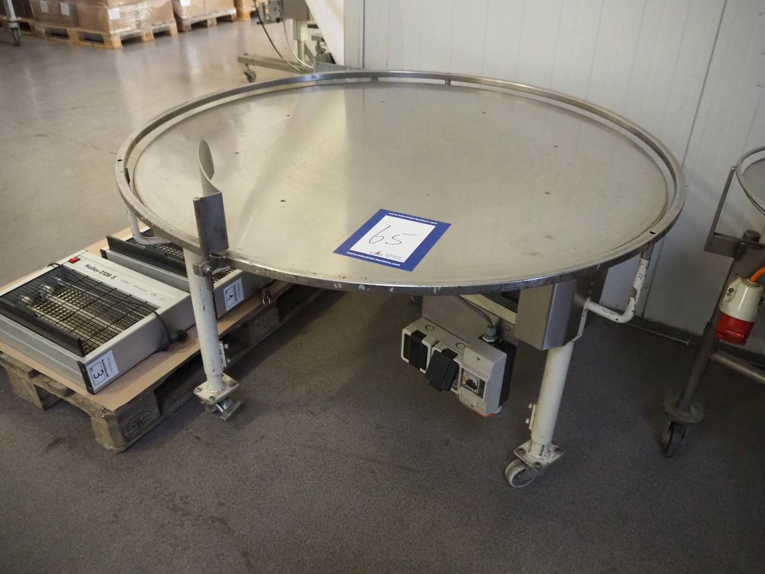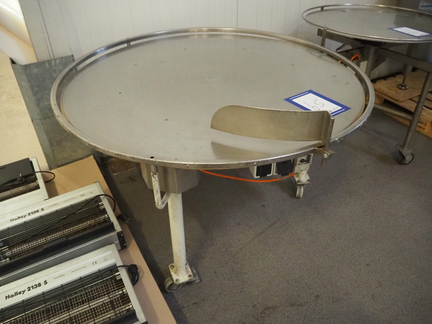 Mobile turning table, steel frame, s/s top, diameter top: 1200 mm, total dimensions: ø 1330 mm x 900 mm.