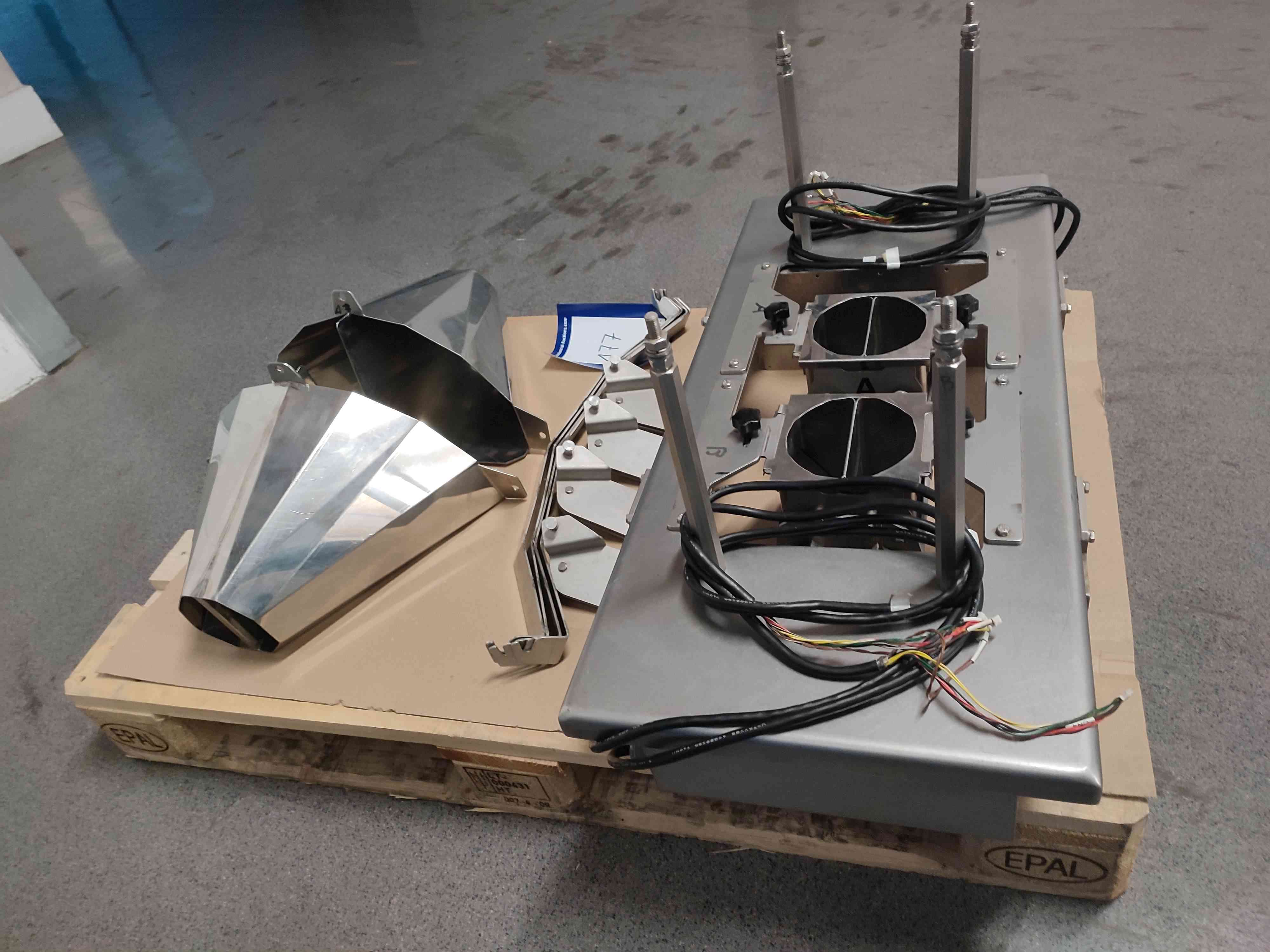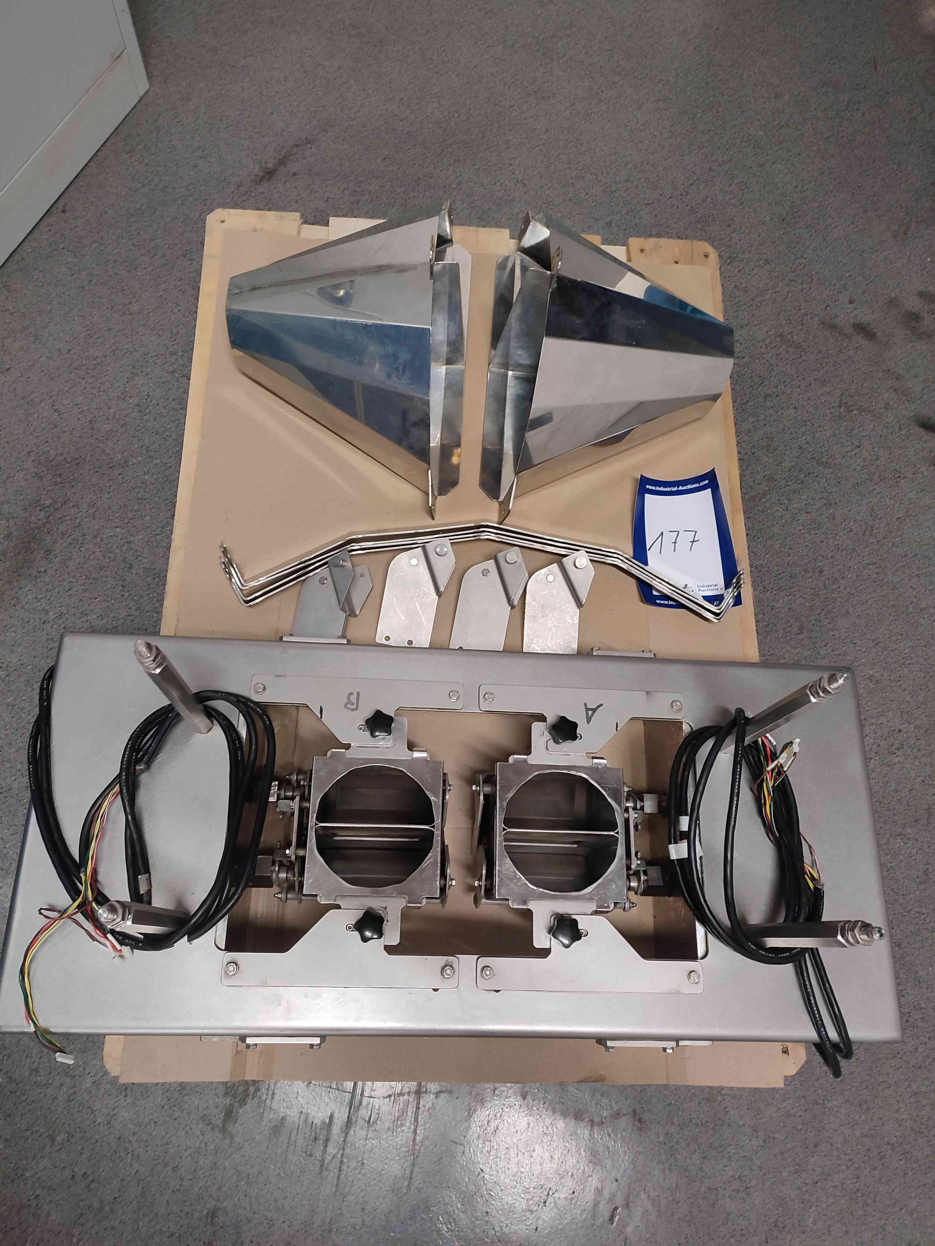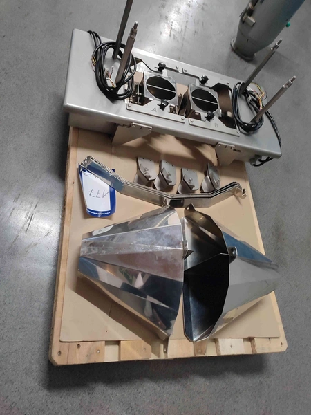 Yamato double timing hopper with discharge chute, dimensions timing hopper: 900 mm x 400 mm x 200 mm and dimensions discharge chute: 44 mm x 440 mm x 300 mm.