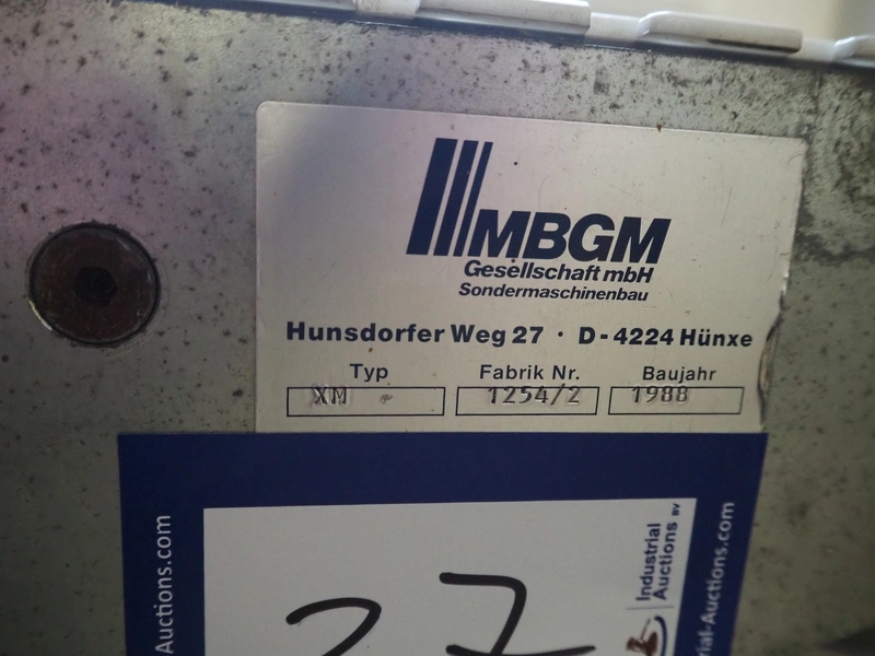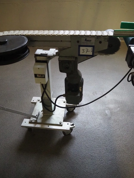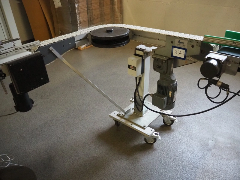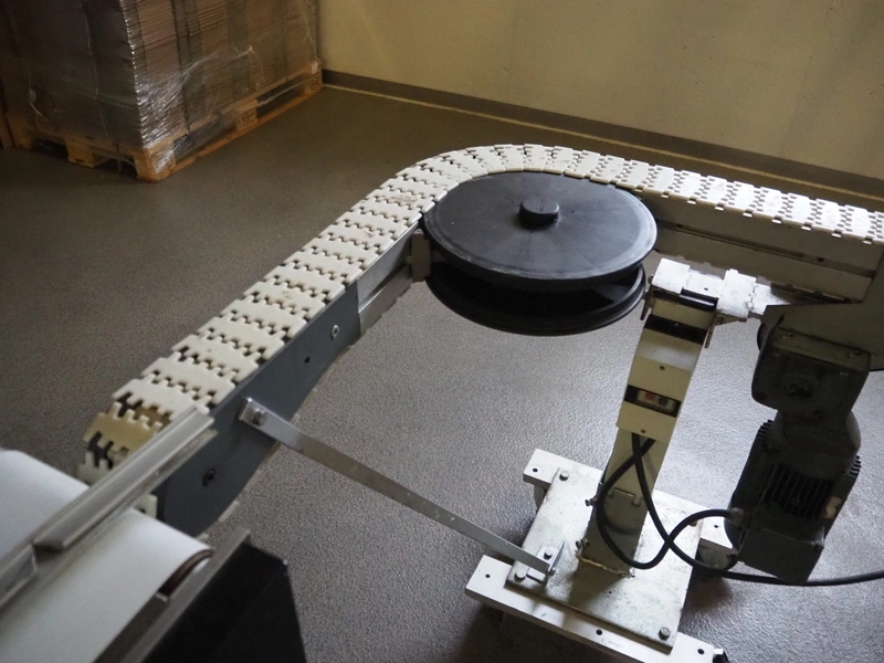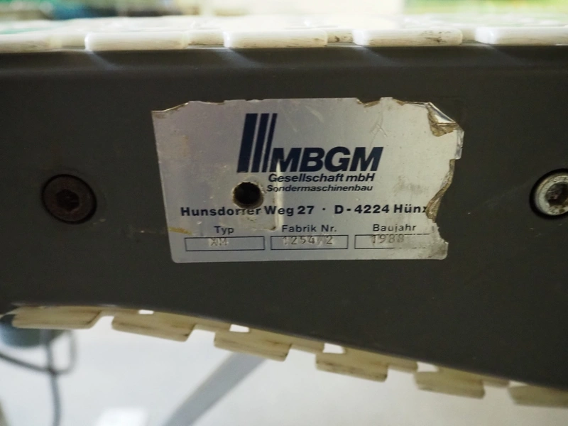 MBGM 90° curve conveyor, type: XM, fabrication number: 1254/2, year of construction: 1988, plastic belt, belt width: 80 mm, total dimensions: 900 mm x 900 mm x 920 mm.