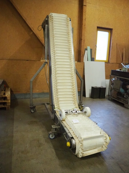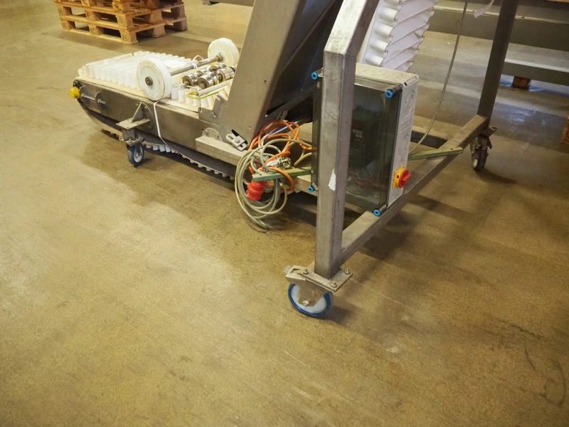 Mobile elevating belt, s/s frame, plastic belt with dividers, dimensions compartments: 340 mm x 60 mm x 60 mm, elevating height: 2500 mm, total dimensions: 3200 mm x 1500 mm x 2500 mm.