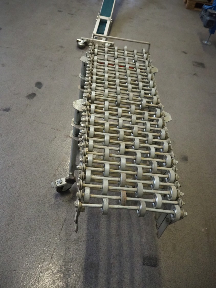 Mobile extendable roller conveyor, total roller width: 300 mm, total dimensions: 1100 mm x 400 mm x 800 mm.