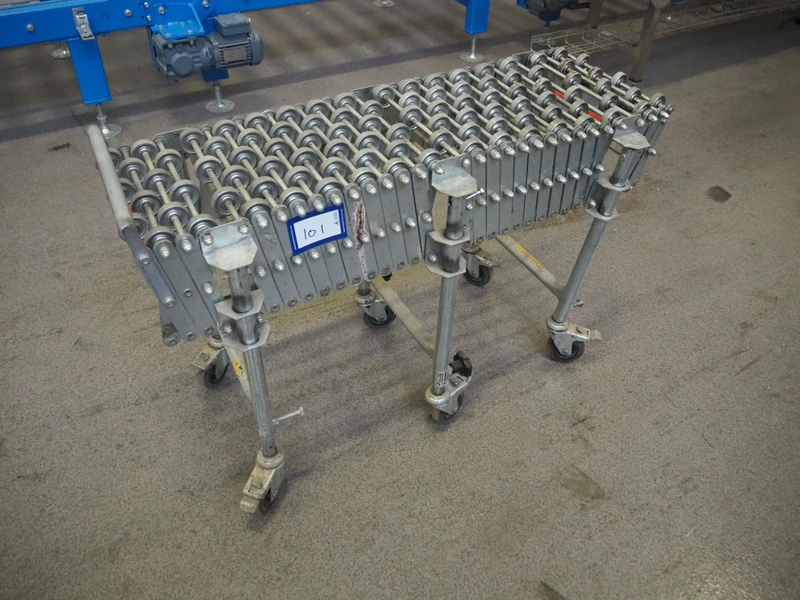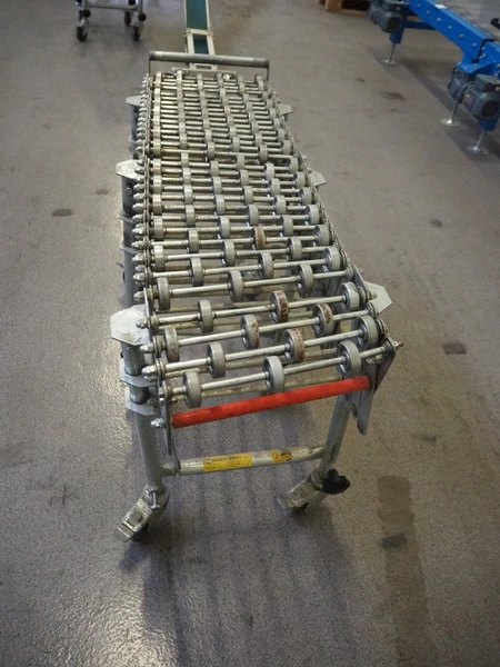 Mobile extendable roller conveyor, total roller width: 300 mm, total dimensions: 1100 mm x 400 mm x 800 mm.