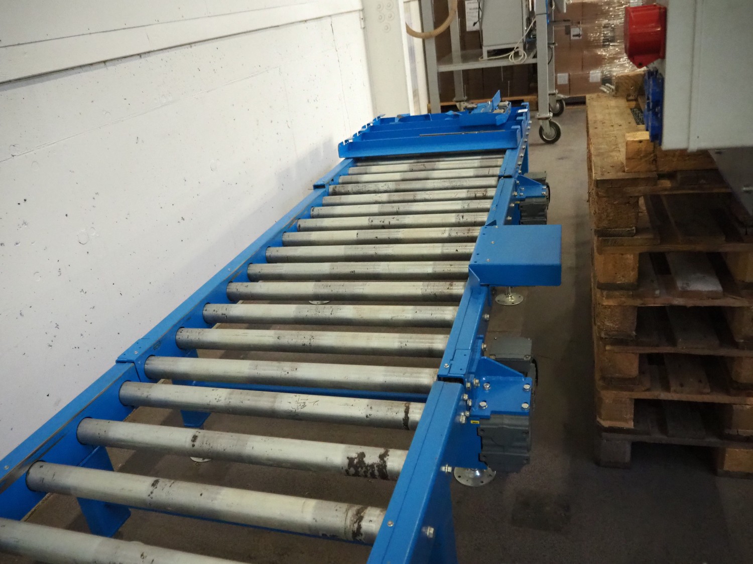 Electric driven roller conveyor for pallets, steel rollers, roller width: 840 mm, total dimensions: 12300 mm x 1150 mm x 700 mm. 7 SEW motors.