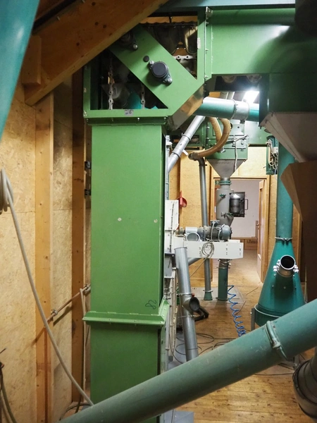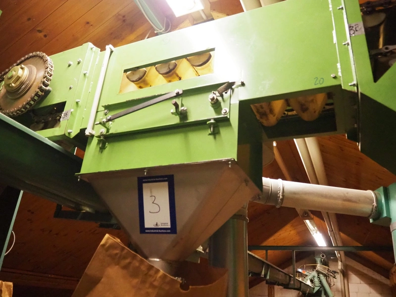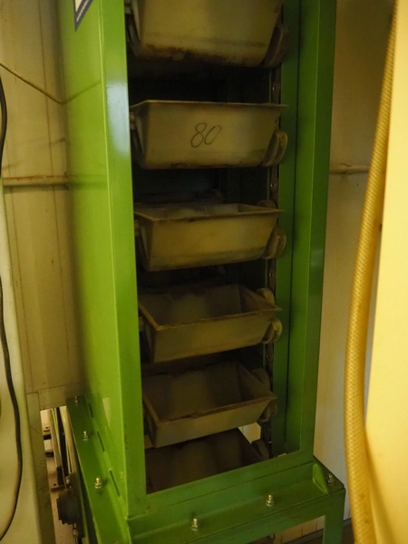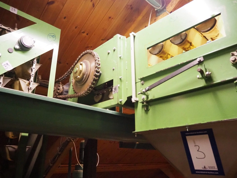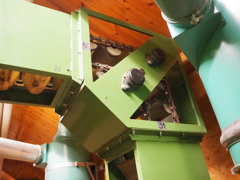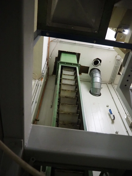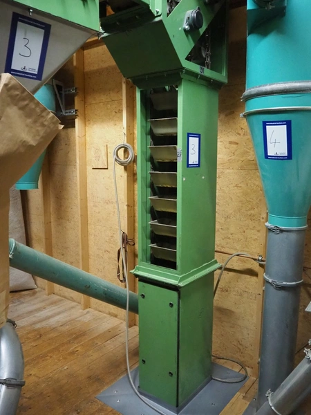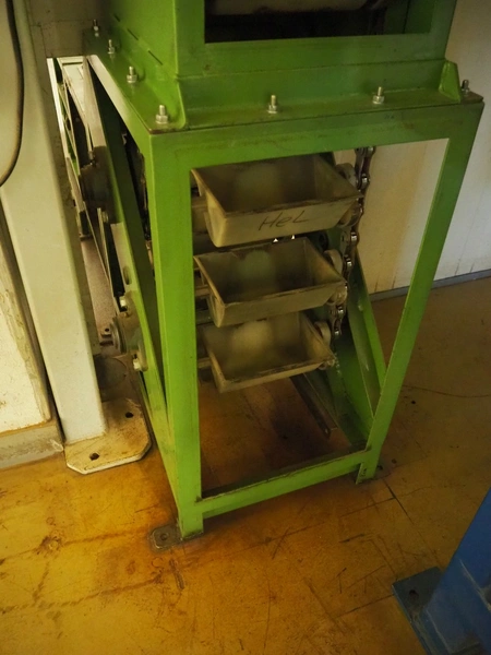 Humbert&Pohl elevating conveyor, dimensions baskets: 140 mm x 210 mm x 100 mm, elevating height: 6280 mm, capacity with wheat flower: 3000 kg/hour, total dimensions: 2700 mm x 400 mm x 7700 mm.