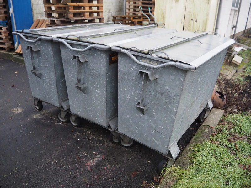 3 mobile steel waste containers, dimensions: (3x) 1650 mm x 750 mm x 1200 mm.