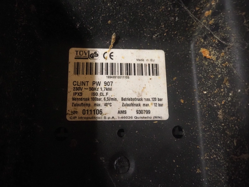 Kärcher mobile high pressure cleaner, model: CLINT PW 907, number: 011106, 230 V, 50 Hz, 1.7 kW, dimensions: 300 mm x 310 mm x 1200 mm.