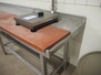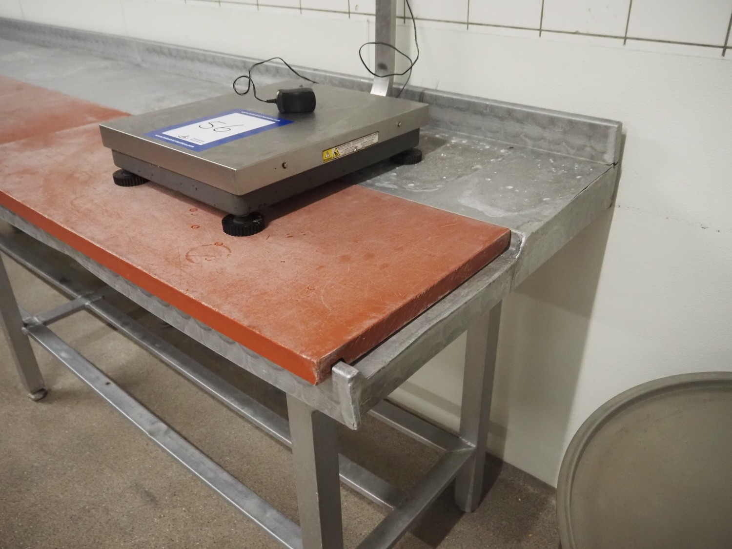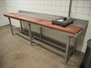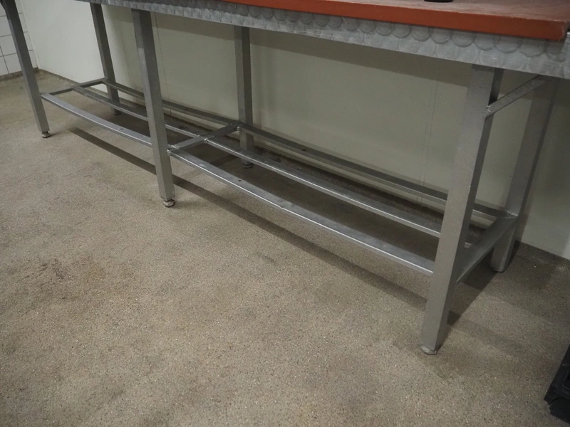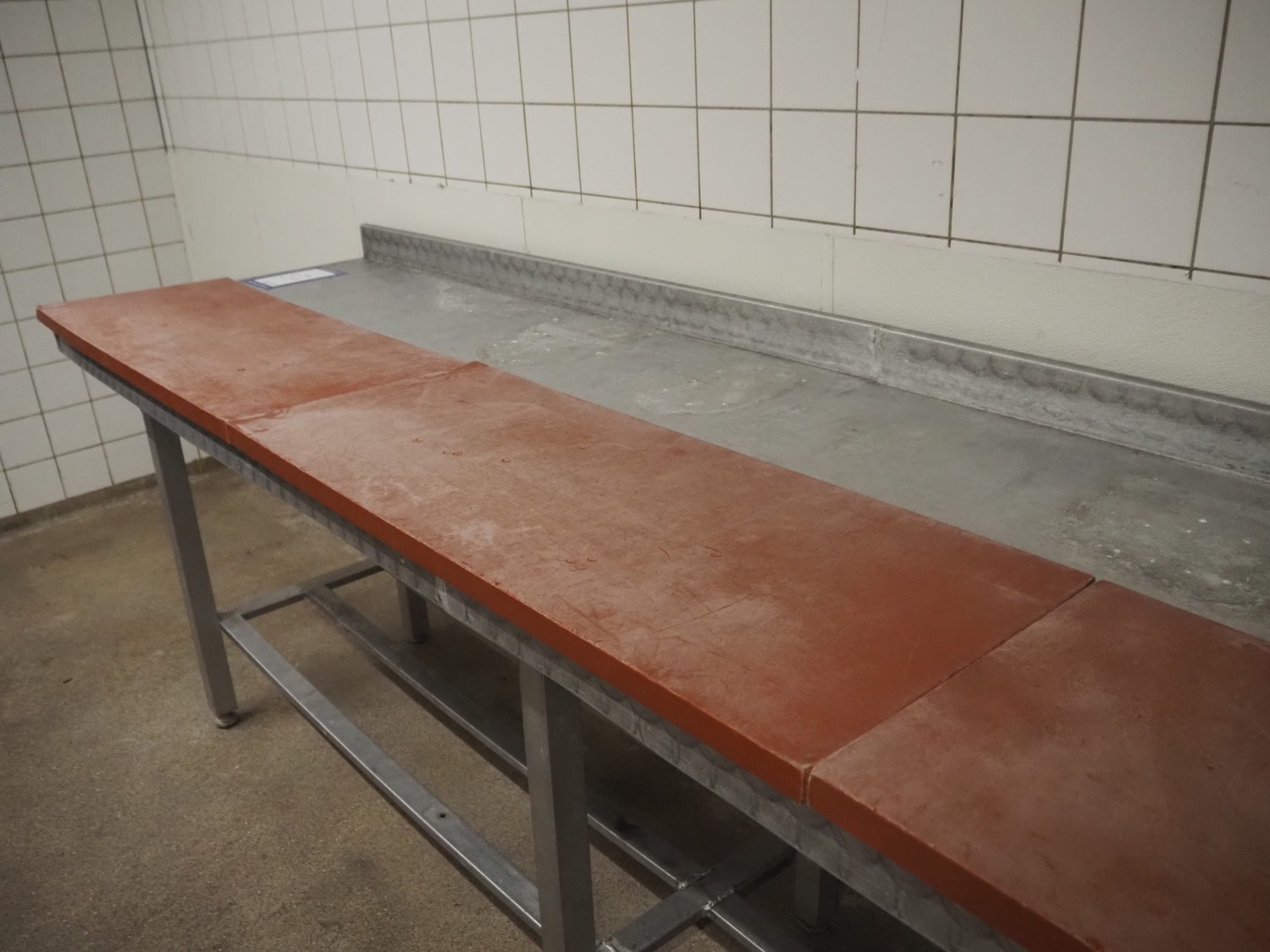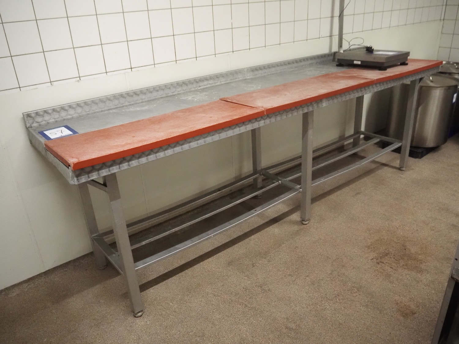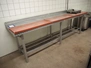S/s and aluminium table with plastic top, dimensions: 3000 mm x 750 mm x 1000 mm.