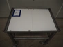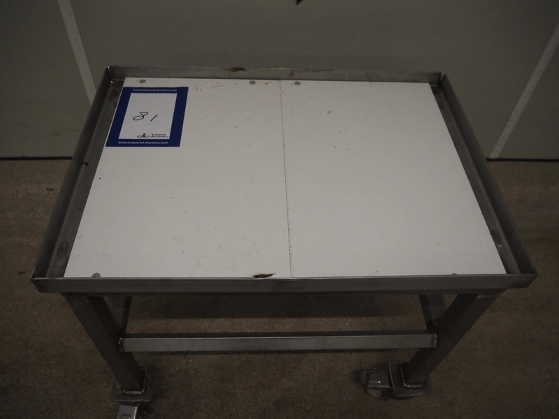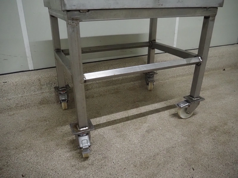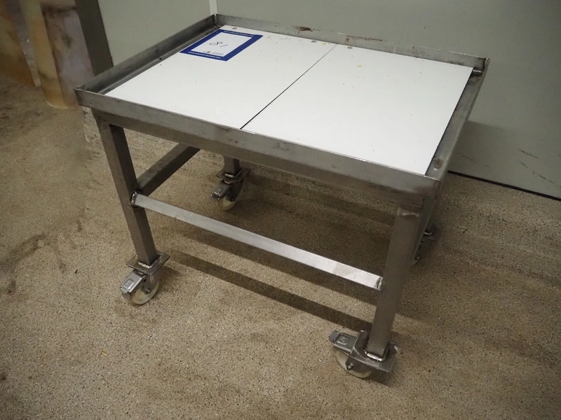 Mobile s/s table with wooden top, dimensions: 770 mm x 550 mm x 670 mm.