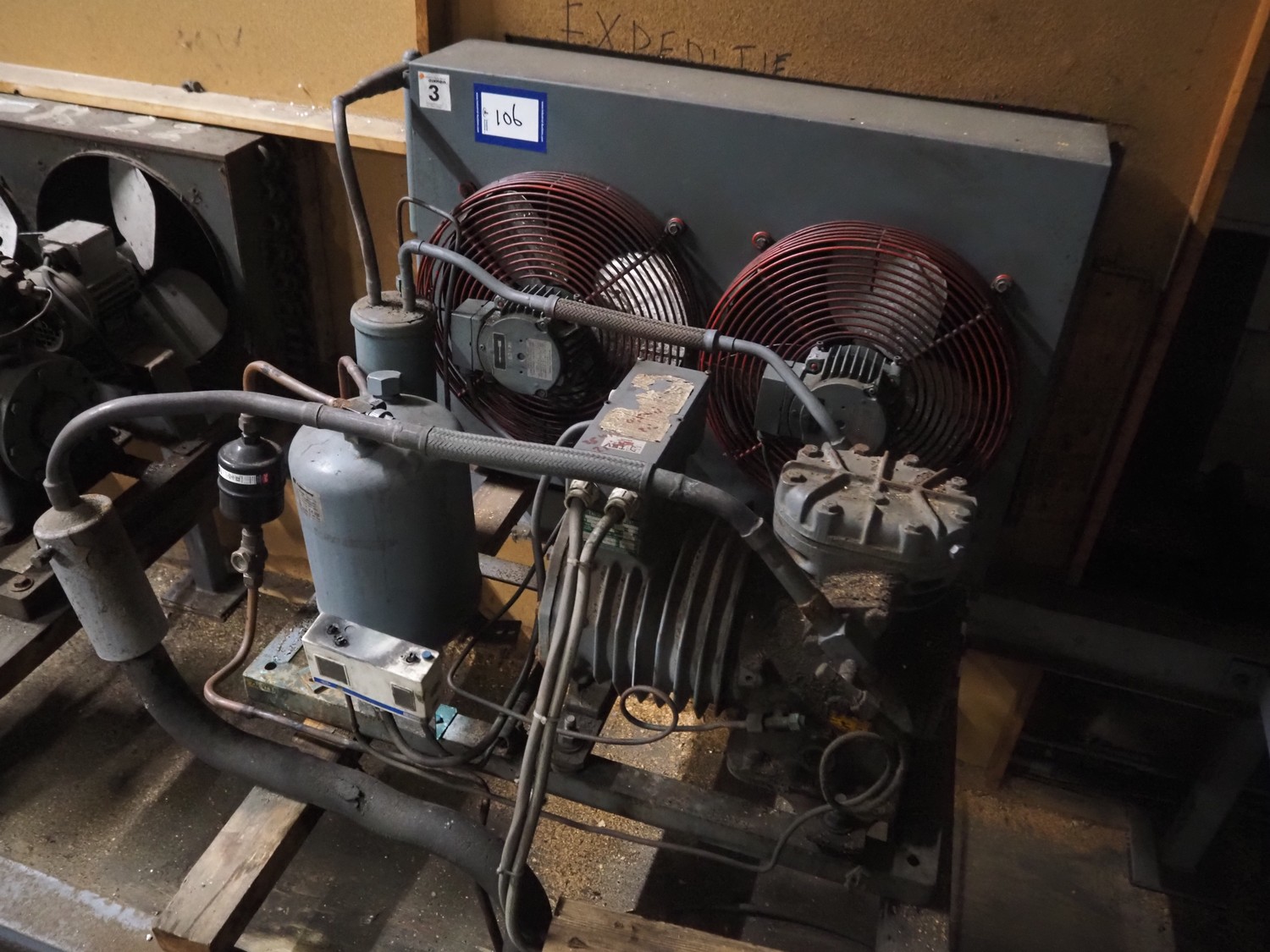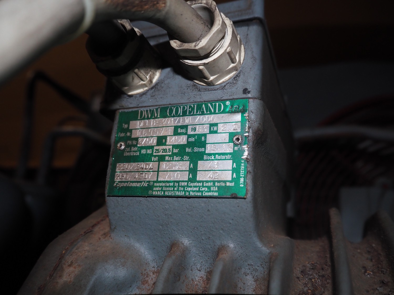 DMW Copeland cooling compressor, type: DLLB-301/EWL/000, factory number: 069573, year of construction: 1983, 220-240 V / 380-420 V, 3 Ph, 50 Hz, 20.5 bar, 18.13 m³/h, refrigerant: R404A / 7 kg, dimensions: 900 mm x 700 mm x 700 mm.