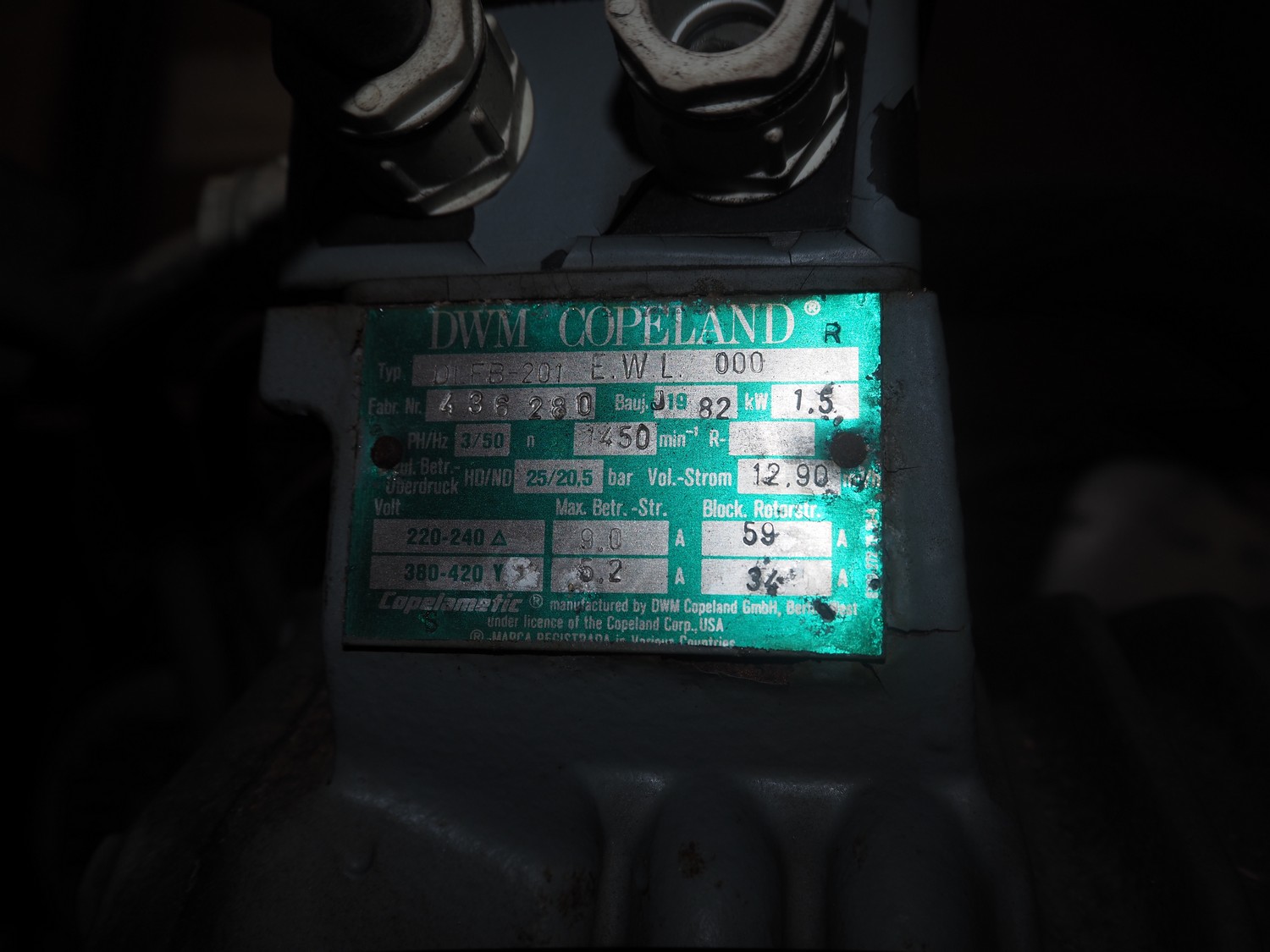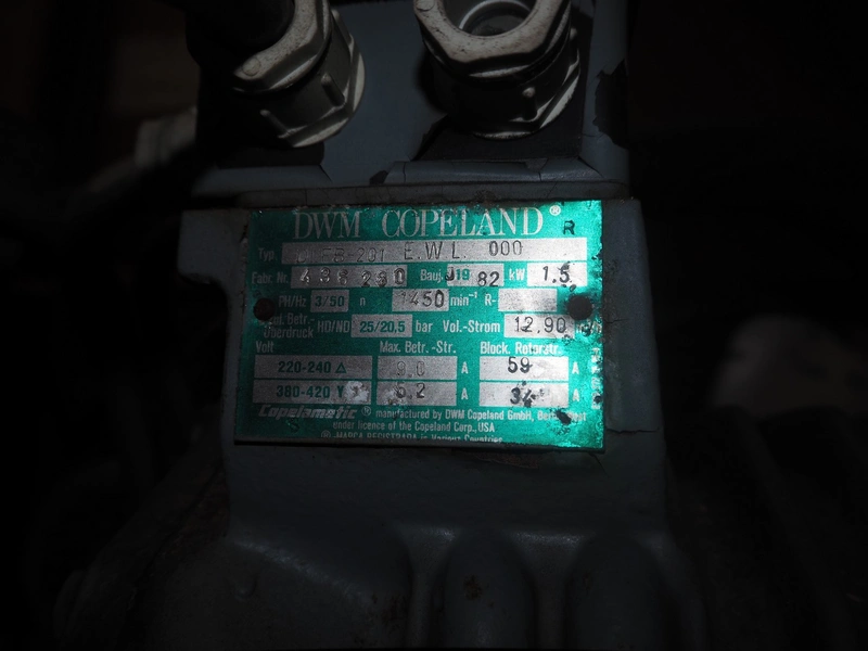 DMW Copeland cooling compressor, type: DLFB-301/EWL/000, factory number: 436280, year of construction: 1982, 220-240 V / 380-420 V, 3 Ph, 50 Hz, 9.0/5.2 A, 1.5 kW, 25/20.5 bar, 12.90 m³/h, refrigerant: R404A / 8 kg, dimensions: 900 mm x 700 mm x 700 mm.