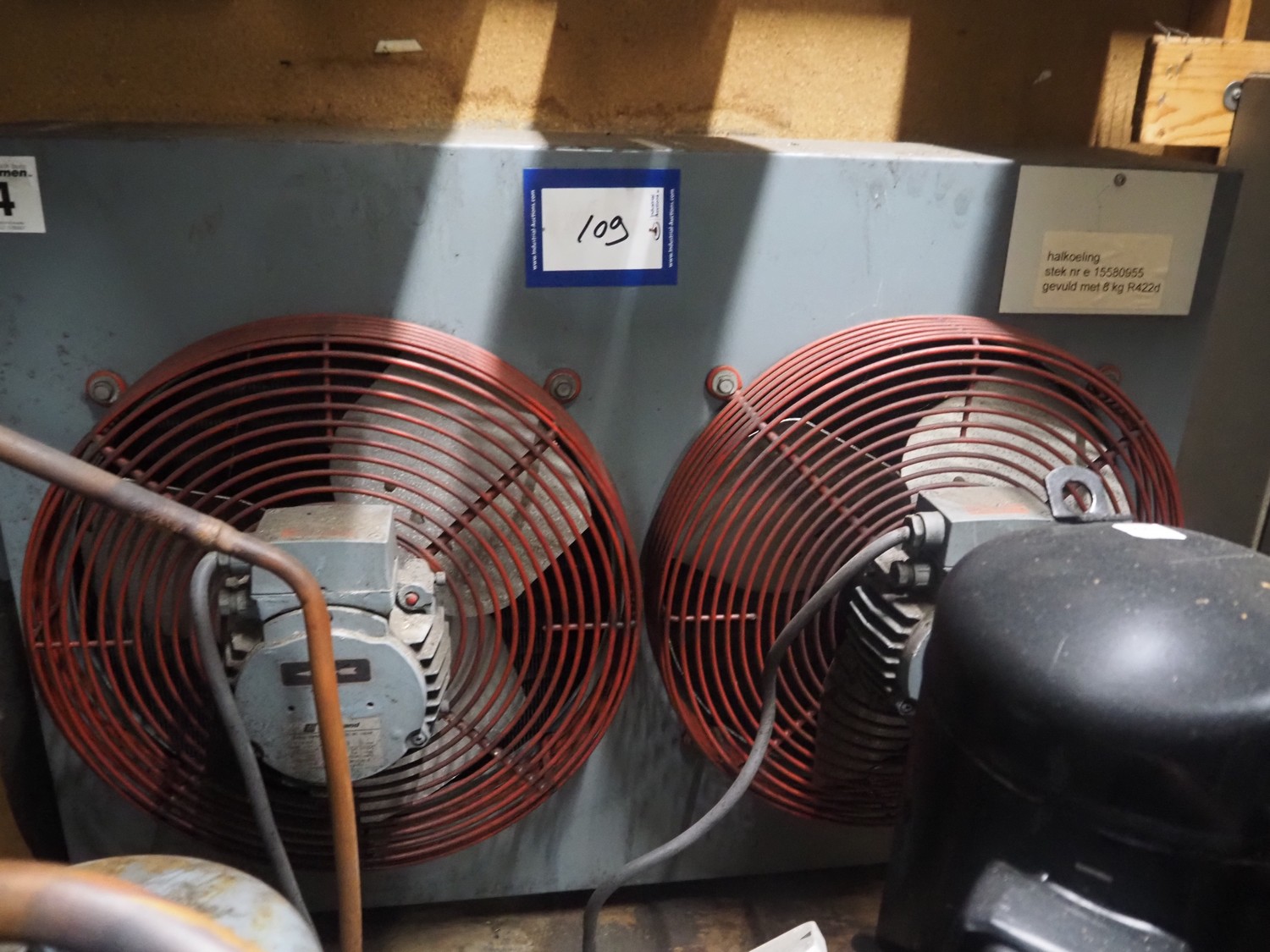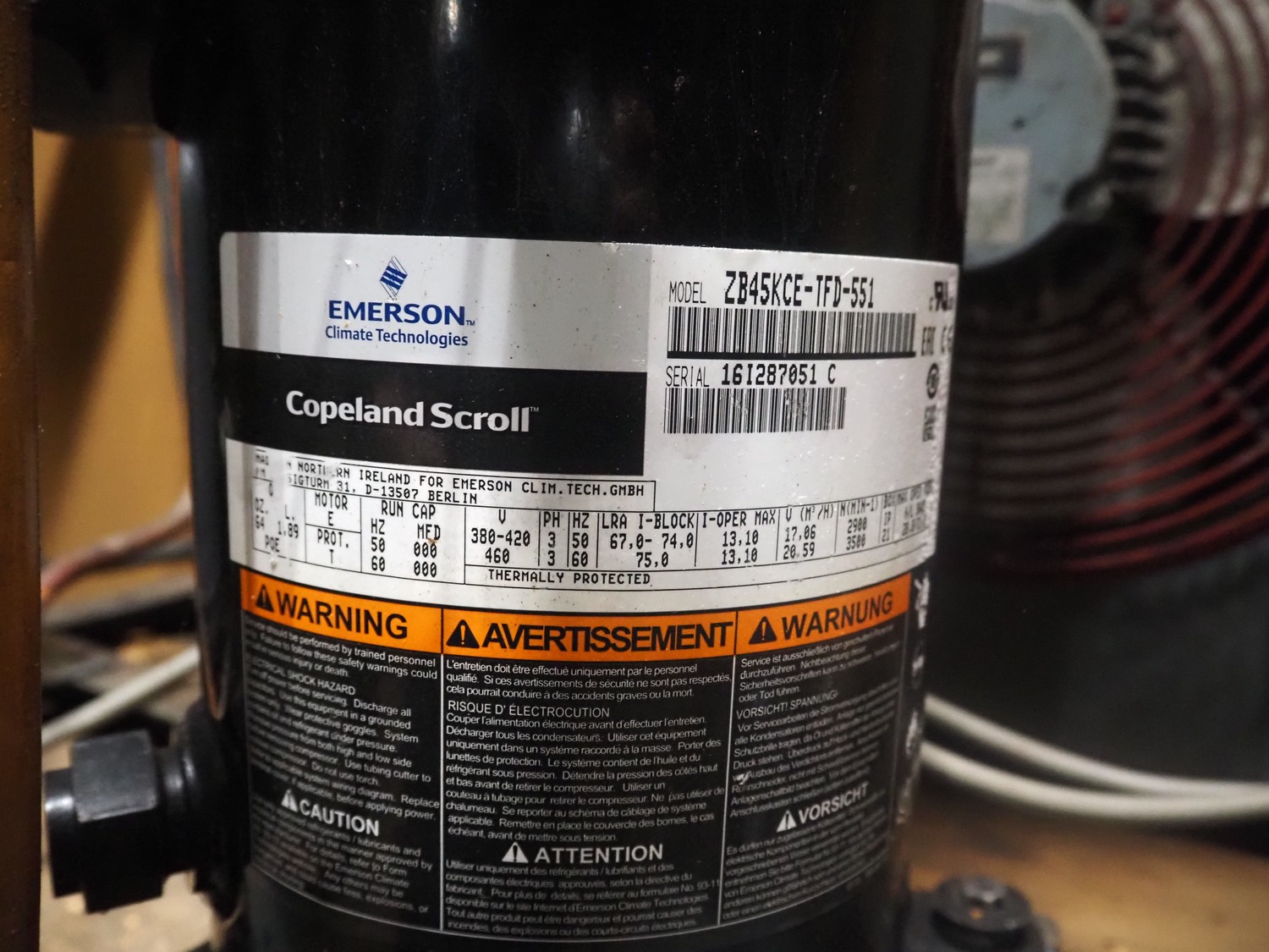 Copeland Scroll cooling compressor, model: ZB45KCE-TFD-551, serial number: 16I287051 C, year of construction: 380-420 / 460 V, 3 Ph, 50/60 Hz, 17.06/20.59 m³ per hour, refrigerant: R422d / 8 kg, dimensions: 900 mm x 700 mm x 700 mm.