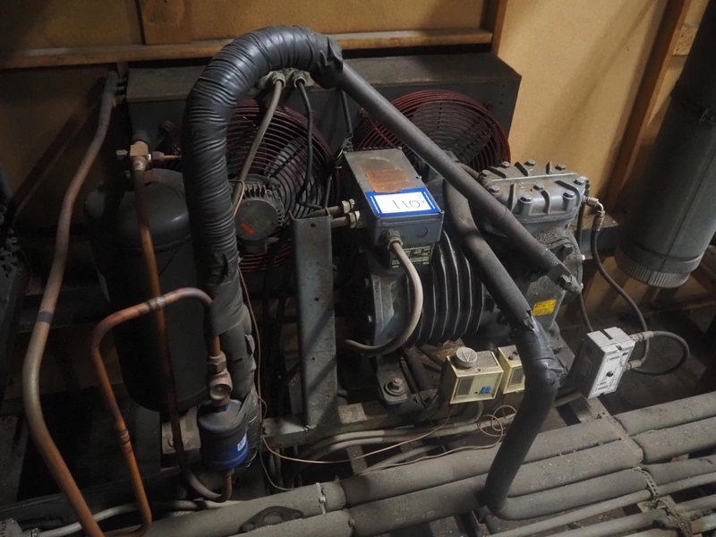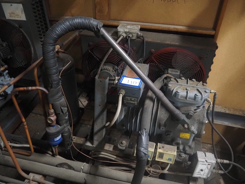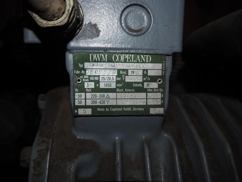 DMW Copeland cooling compressor, type: DLLE-401/EWL/000, factory number: 0897124, year of construction: 1992, 220-240 V / 380-420 V, 3 Ph, 50 Hz, 16.1/9.3 A, 20.5 bar, 18.13 m³/h, refrigerant: R134a / 8 kg, dimensions: 900 mm x 700 mm x 700 mm.