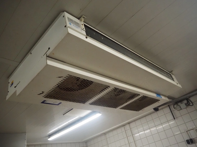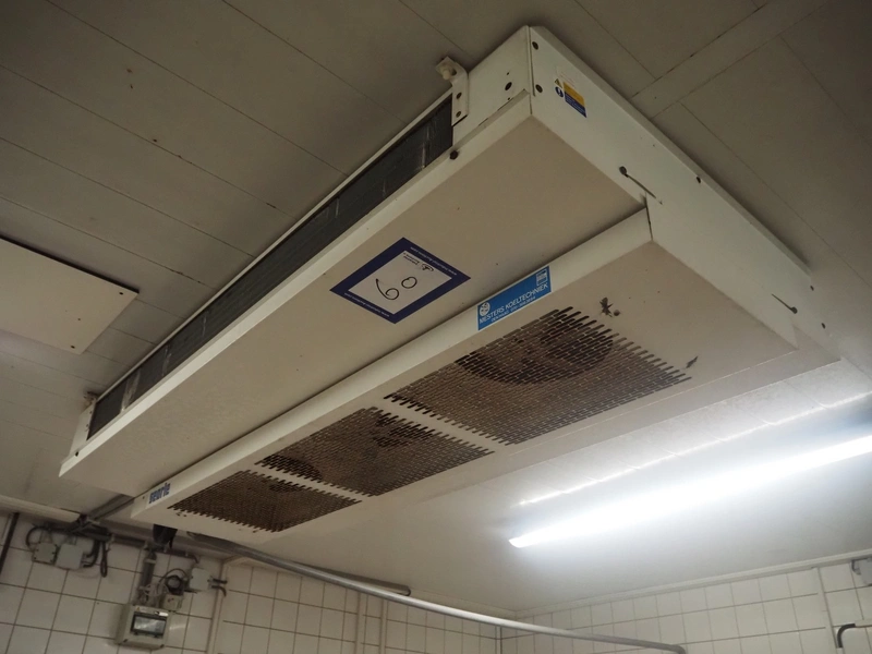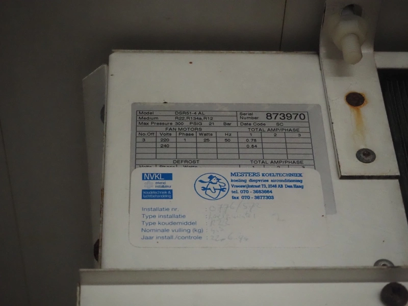 Searle evaporator, 3 fans, model: DSR51-4 AL, serial number: 873970, 220-240 V, 1 Ph, 50 Hz, 0.75/0.84 A, 25 W, refrigerant: R22 / R134a / R12, dimensions: 1500 mm x 800 mm x 750 mm.