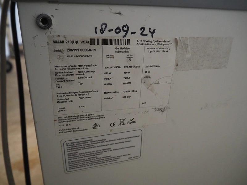 AHT Cooling Systems GmbH mobile freezer, model: MIAMI 210(U)L VSAD, serial number: 206191 00004659, 220-240 V, 50 Hz, 2.8 A, 750 W, volume: 572 dm³ (freezing) and 373 dm³ (cooling), refrigerant: R290 /0.100 kg, dimensions: 2150 mm x 860 mm x 1030 mm.