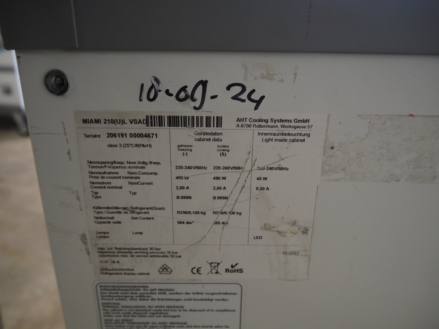 AHT Cooling Systems GmbH mobile freezer, model: MIAMI 210(U)L VSAD, serial number: 206191 00004671, year of construction: 011-2012, 220-240 V, 50 Hz, 2.8 A, 750 W, volume: 572 dm³ (freezing) and 373 dm³ (cooling), refrigerant: R290 /0.100 kg, dimensions: 2150 mm x 860 mm x 1030 mm.