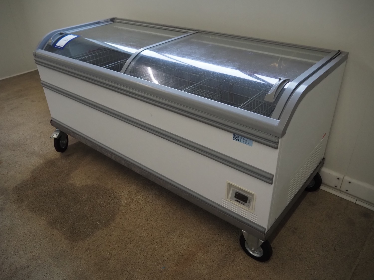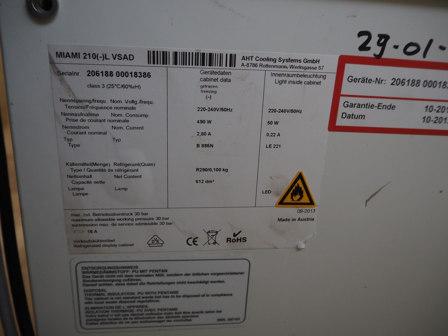 AHT Cooling Systems GmbH mobile freezer, model: MIAMI 210(U)L VSAD, serial number: 206188 00018386, year of construction: 09-2013, 220-240 V, 50 Hz, 2.8 A, 750 W, volume: 572 dm³ (freezing) and 373 dm³ (cooling), refrigerant: R290 /0.100 kg, dimensions: 2150 mm x 860 mm x 1030 mm.