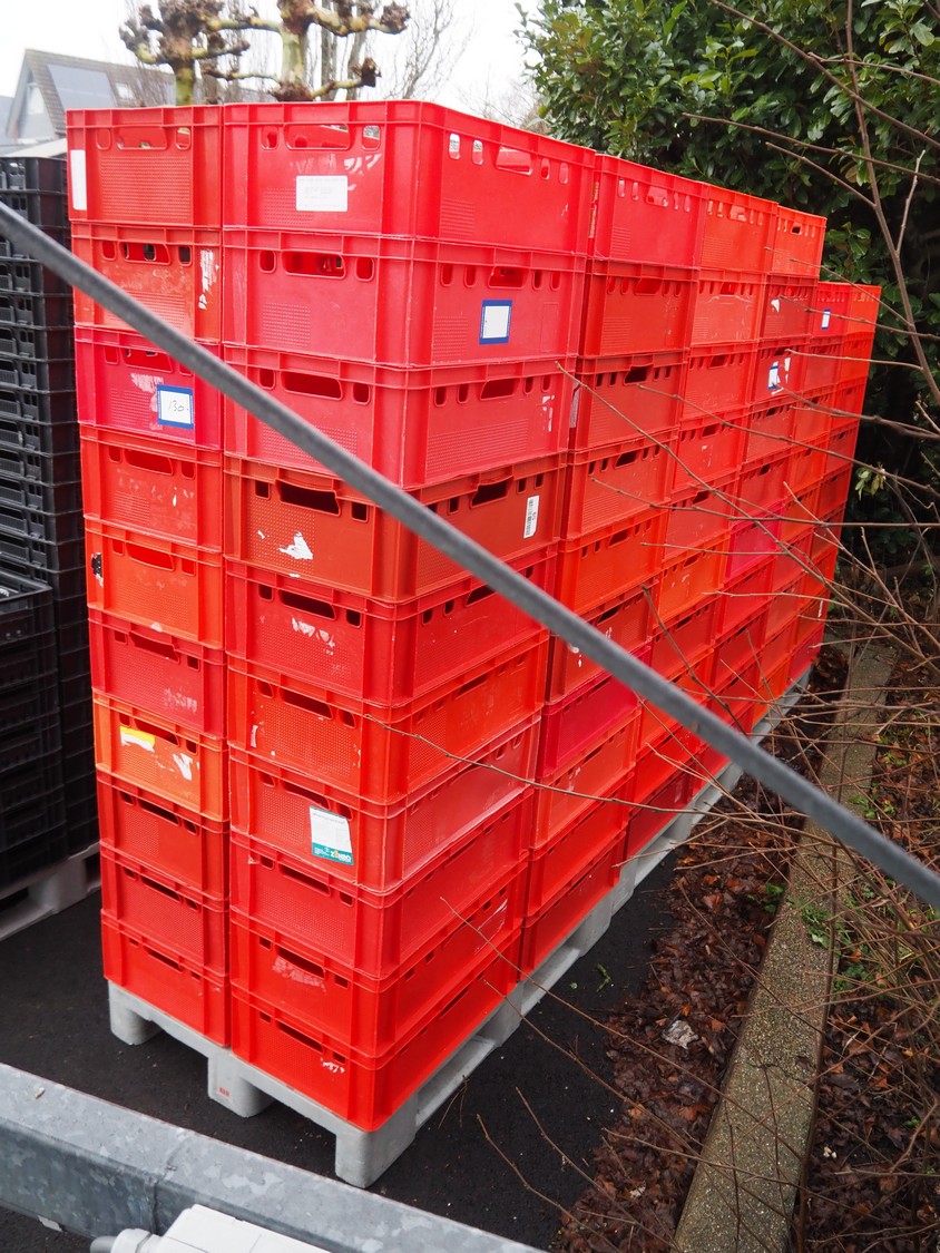 3 pallets with approximately 116 plastic crates, dimensions each crate: 600 mm x 400 mm x 120 mm.