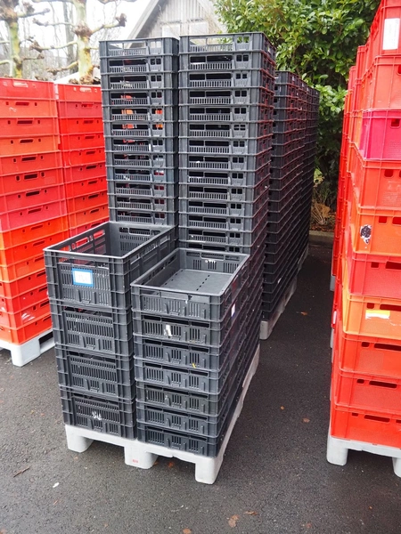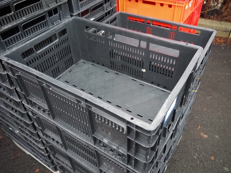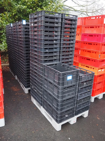 3 pallets with approximately 270 plastic crates, dimensions each crate: 600 mm x 400 mm x 240 mm and 600 mm x 400 mm x 80 mm.