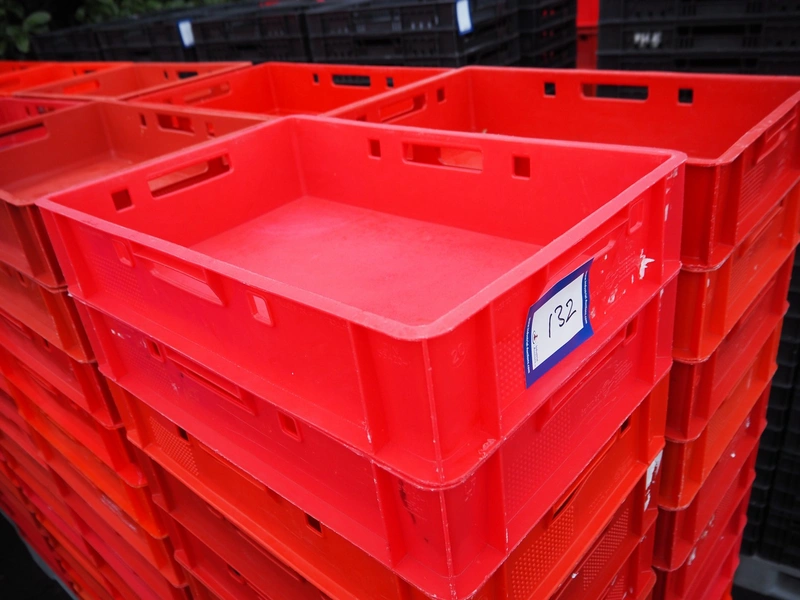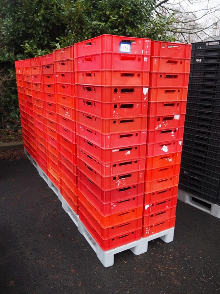 3 pallets with approximately 180 E1-plastic crates, dimensions each crate: 600 mm x 400 mm x 240 mm and 600 mm x 400 mm x 80 mm.