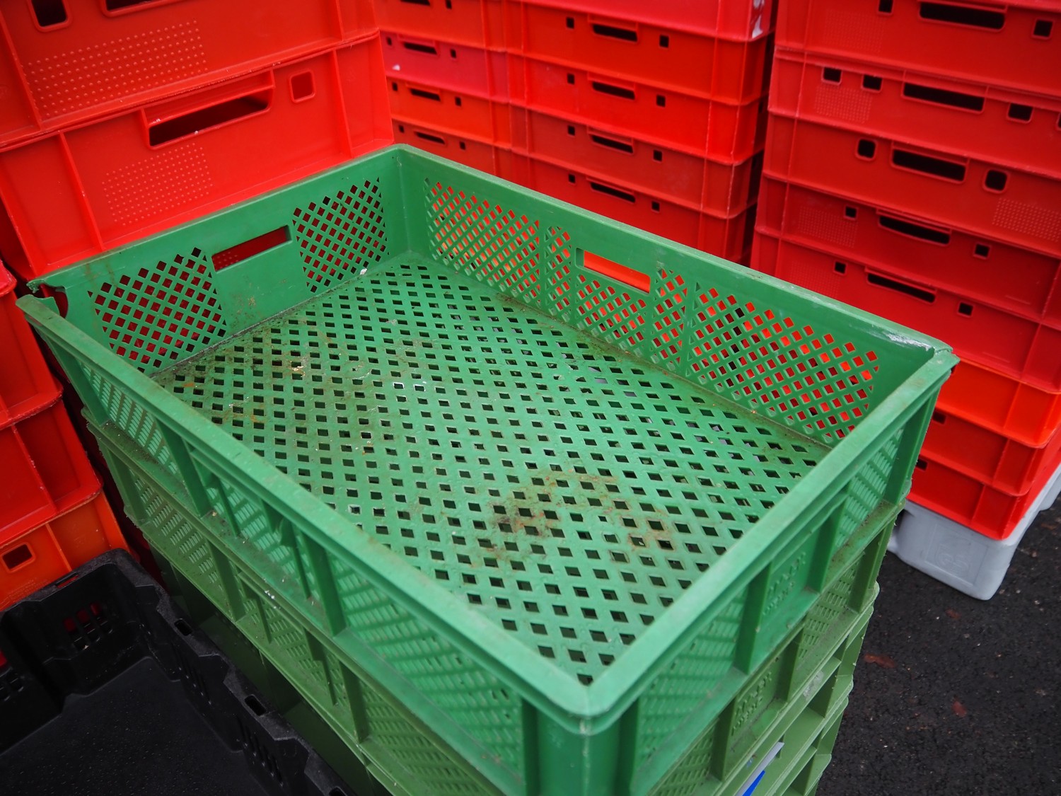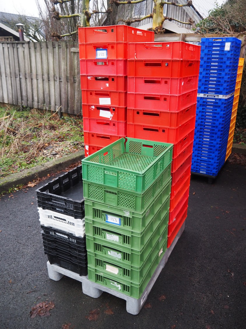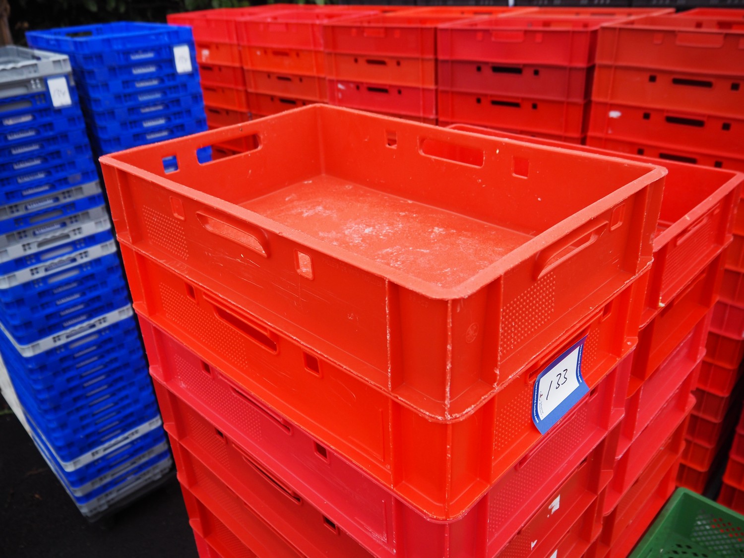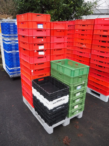 Pallet with approximately 44 plastic crates, dimensions crates: 600 mm x 400 mm x 130 mm and 600 mm x 400 mm x 140 mm.