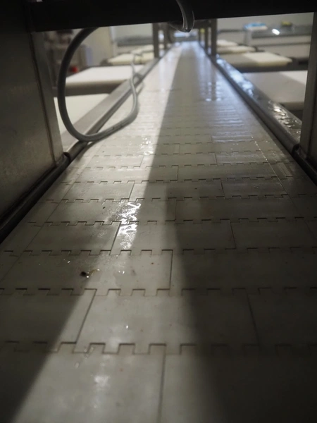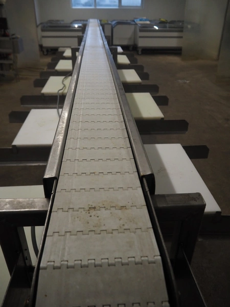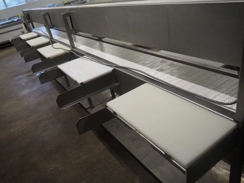 Sorting conveyor with (2x) 5 stations, s/s frame, plastic belts, belt width: (top) 150 mm and (bottom) 300 mm, total dimensions: 6500 mm x 1200 mm x 1400 mm.