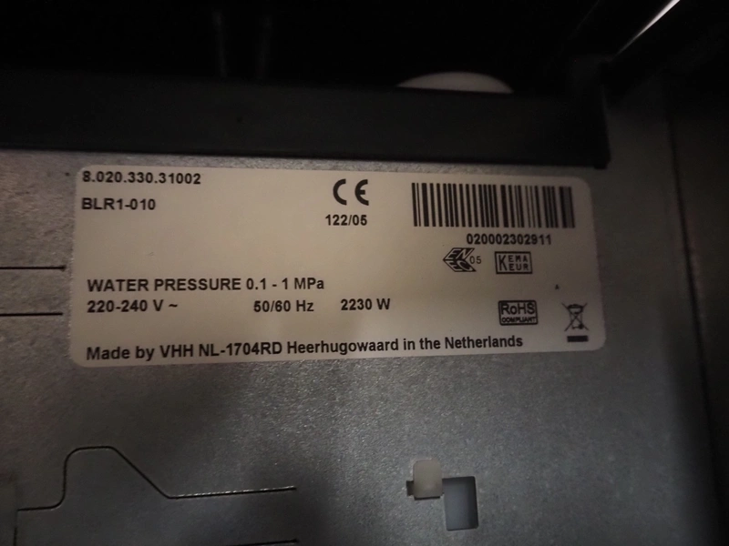 VHH coffee machine, model: BLR1-010, number: 8.020.330.31002, 220-240 V, 50/60 Hz, 2230 W, dimensions: 200 mm x 400 mm x 600 mm.