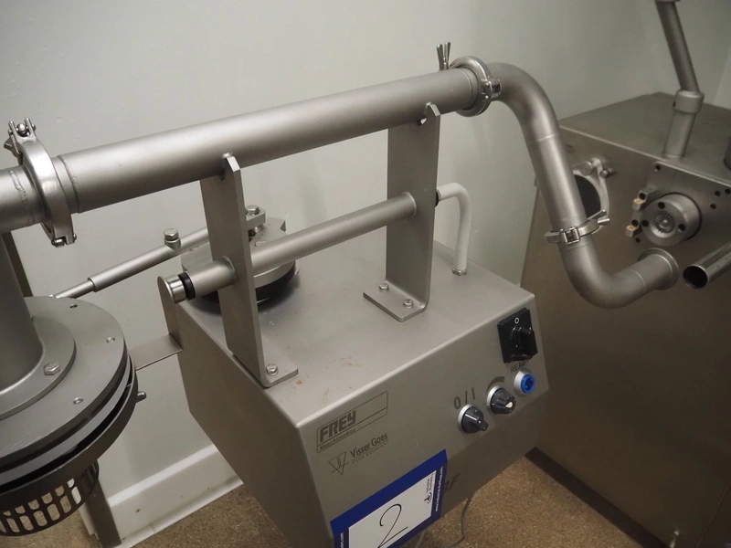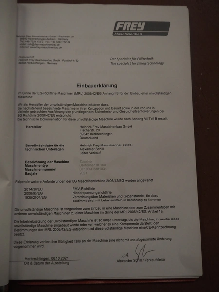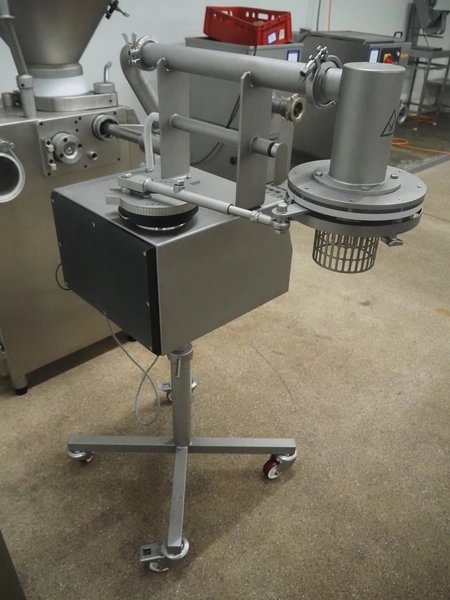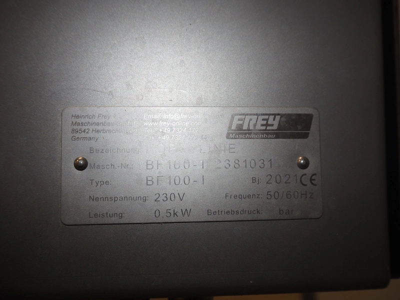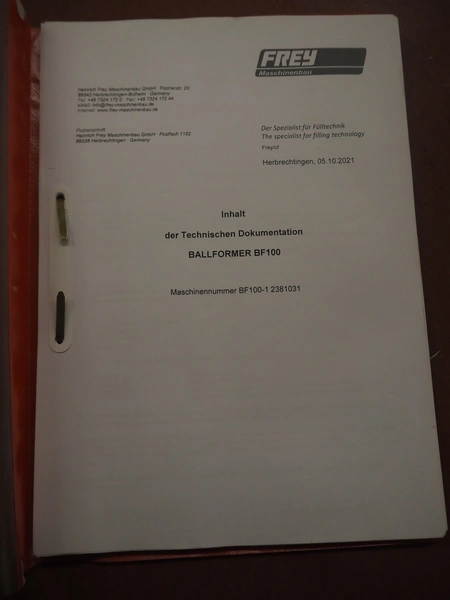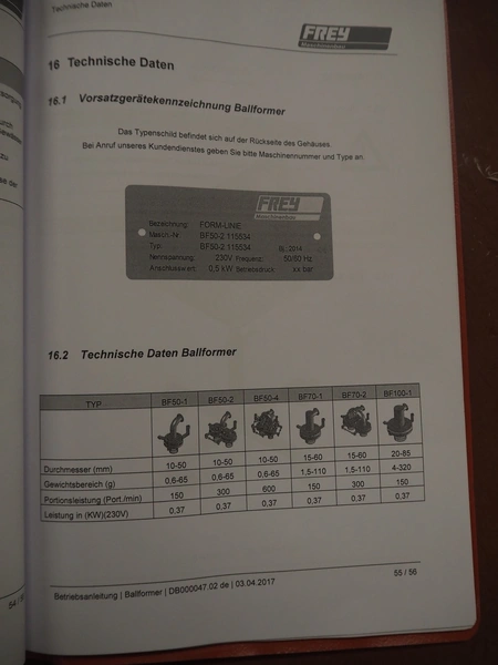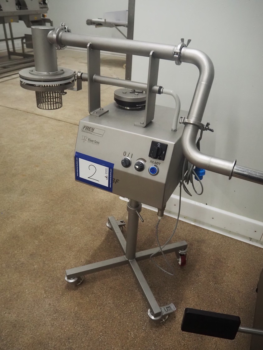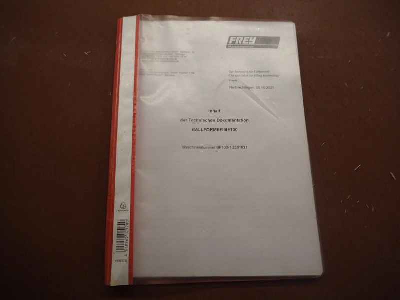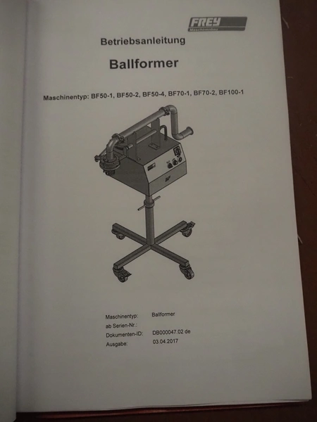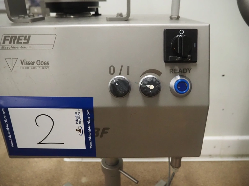 Frey Maschinenbau mobile meat ball forming machine / diaphragm, type: BF100-1, machine number: BF100-1 2381031, year of construction: 2021, 230 V, 50/60 Hz, 0.5 kW, clearance: 20-85 mm, weight reach: 4-320 gram, capacity: 150 portions / minute, dimensions: 1100 mm x 600 mm x 1400 mm.