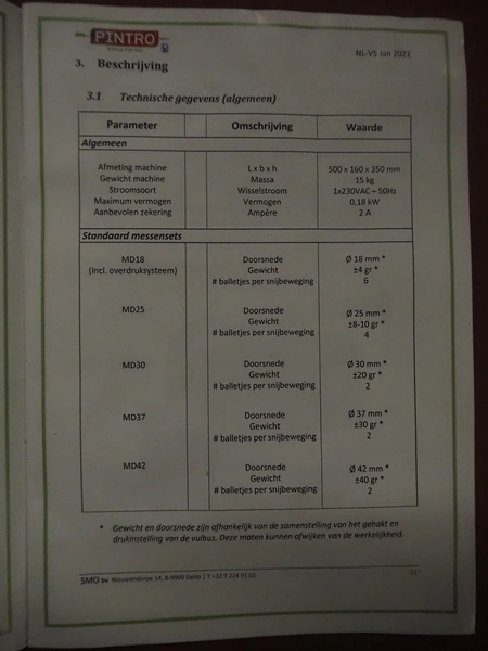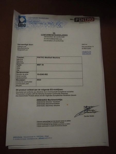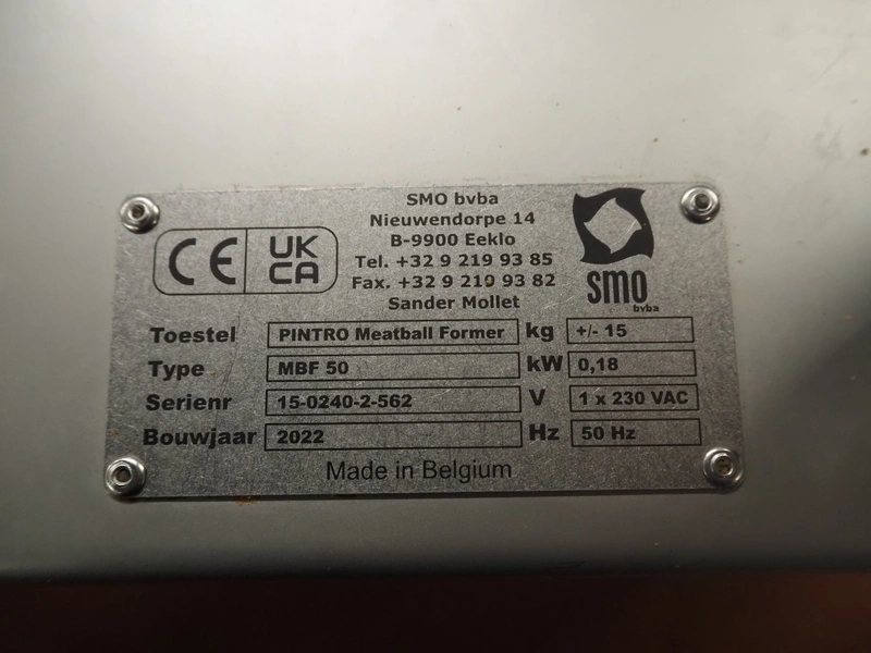 SMO bvba meatball forming attachment in carton box, type: MBF 50, serial number: 15-0240-2-562, year of construction: 2022, 230 V, 1 Ph, 50 Hz, 0.18 kW, total dimensions box: 600 mm x 400 mm x 200 mm.