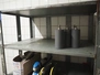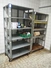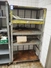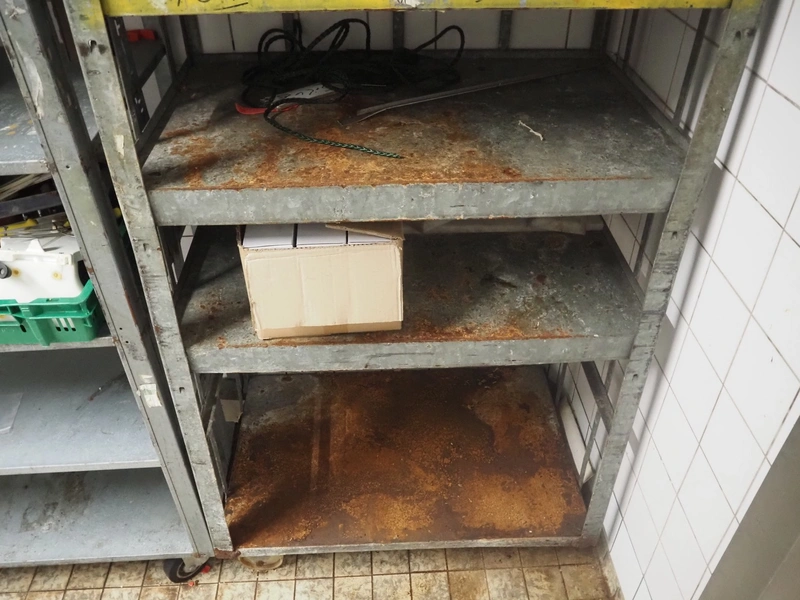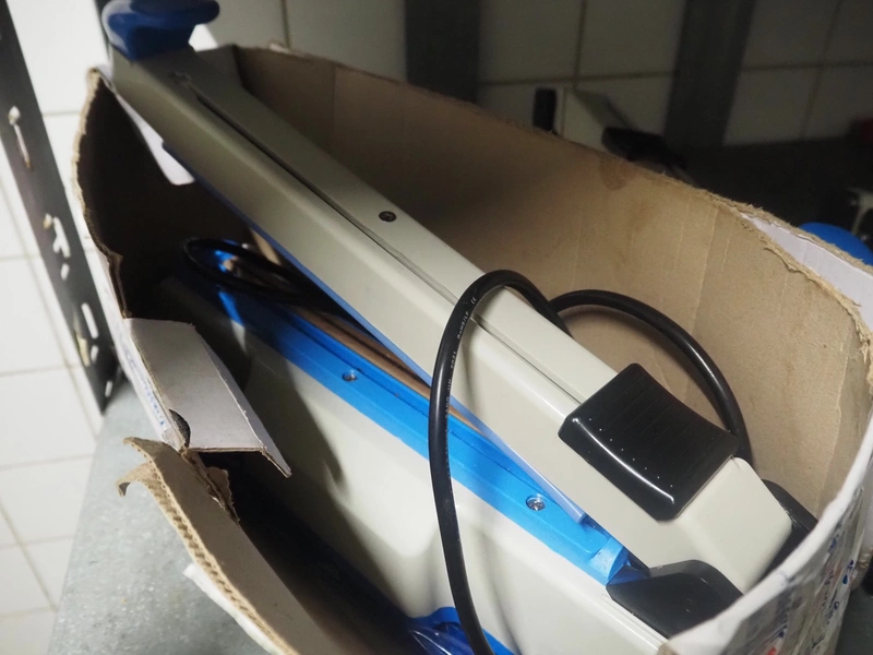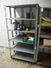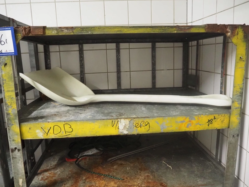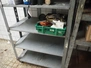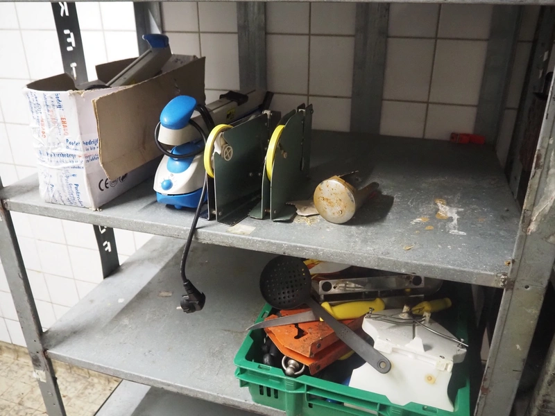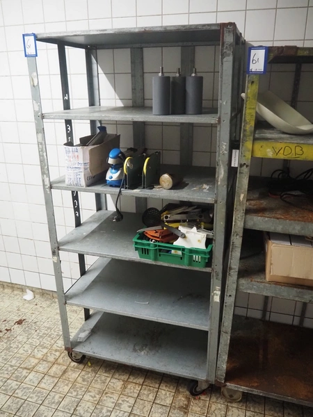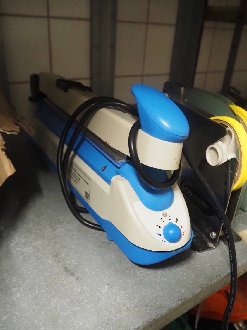 2 steel racks with various knives, knife sharpeners and 2 seal machines, dimensions racks: 950 mm x 640 mm x 1880 mm and 950 mm x 650 mm x 1900 mm.
