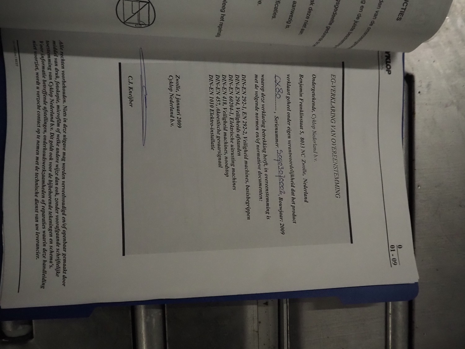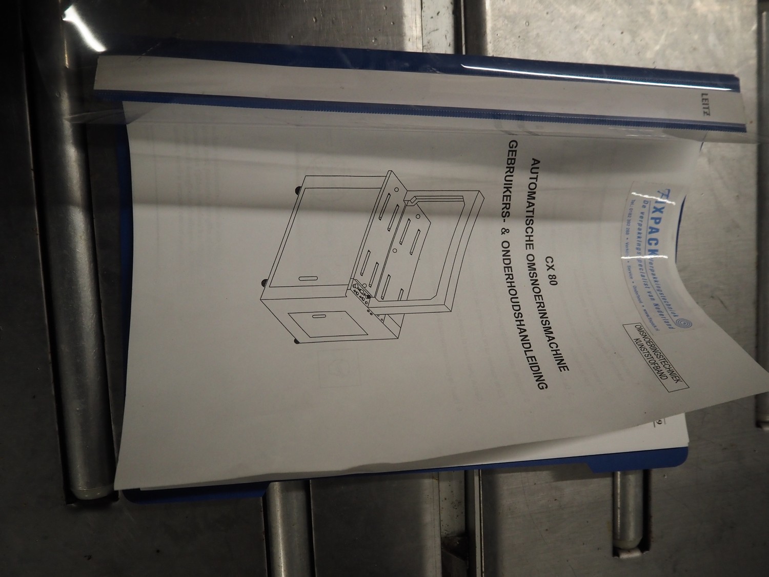 Fixpack mobile strapping machine, model: CX80, machine number: s0903070002, year of construction: 2009, 230 V, 50 Hz, clearance: 850 mm x 600 mm, total dimensions: 1120 mm x 550 mm x 1500 mm.