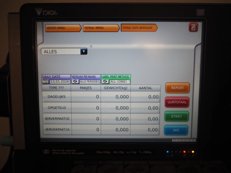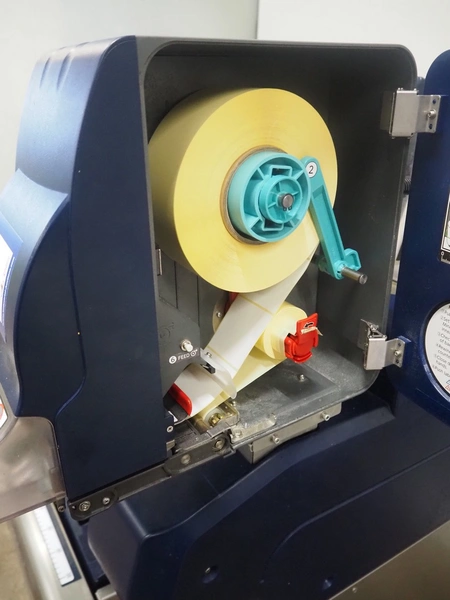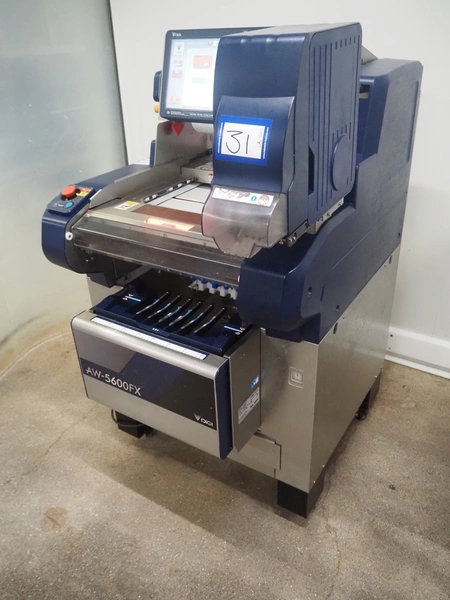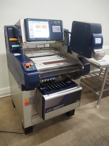 Teraoka Seiko Co., LTD weigh-, wrap and label system, model: AW-5600FX, serial number: 17052429, year of construction: 2017, 220-240 V, 1 Ph, 50/60 Hz, 1.8 kW, film width: 400 mm, maximum weight: 3/6 kg, minimum weight: 20 gram, e= 1/2 gram, T= -2999 gram, weight: 250 kg, total dimensions: 800 mm x 1000 mm x 1450 mm.