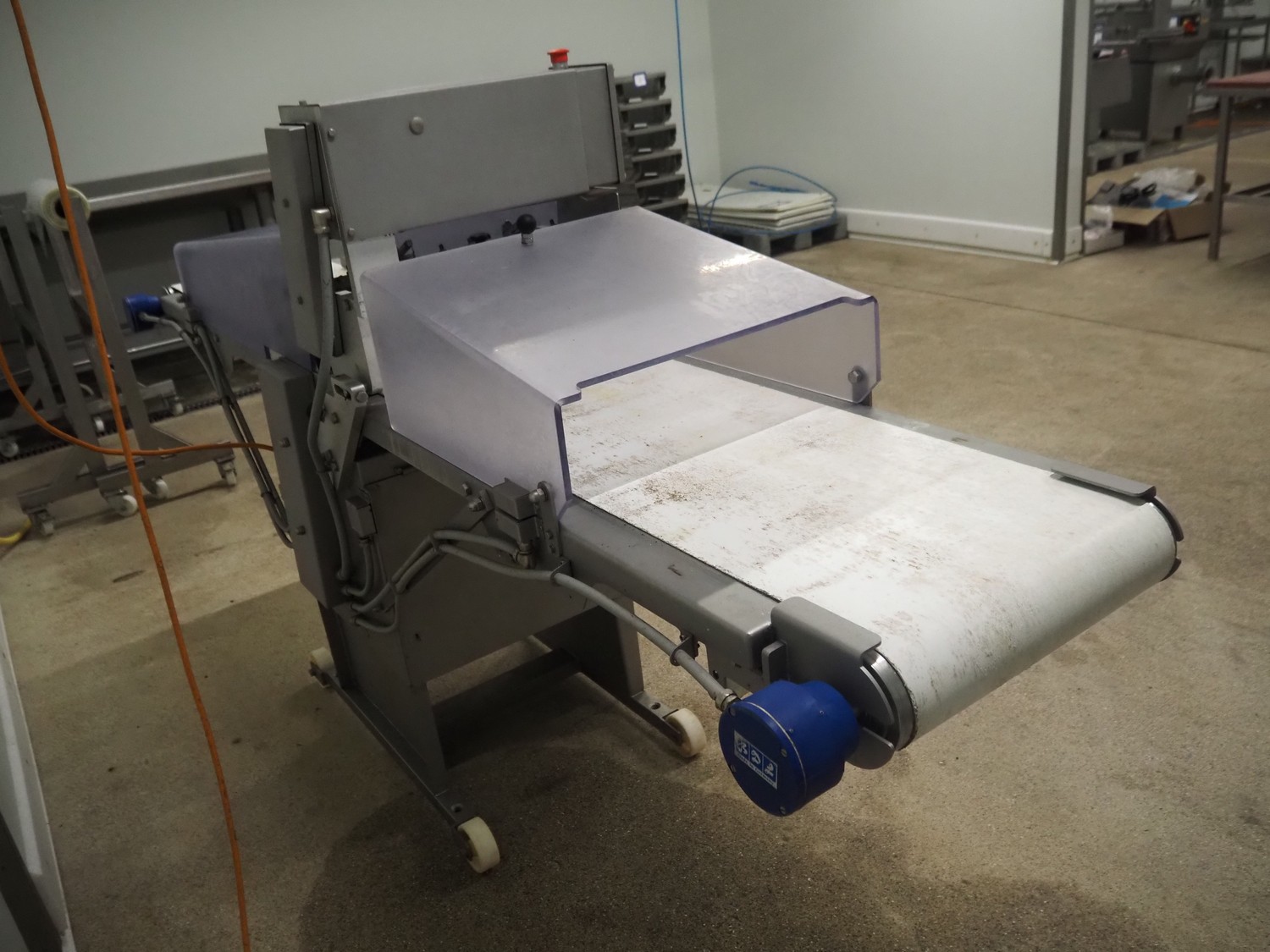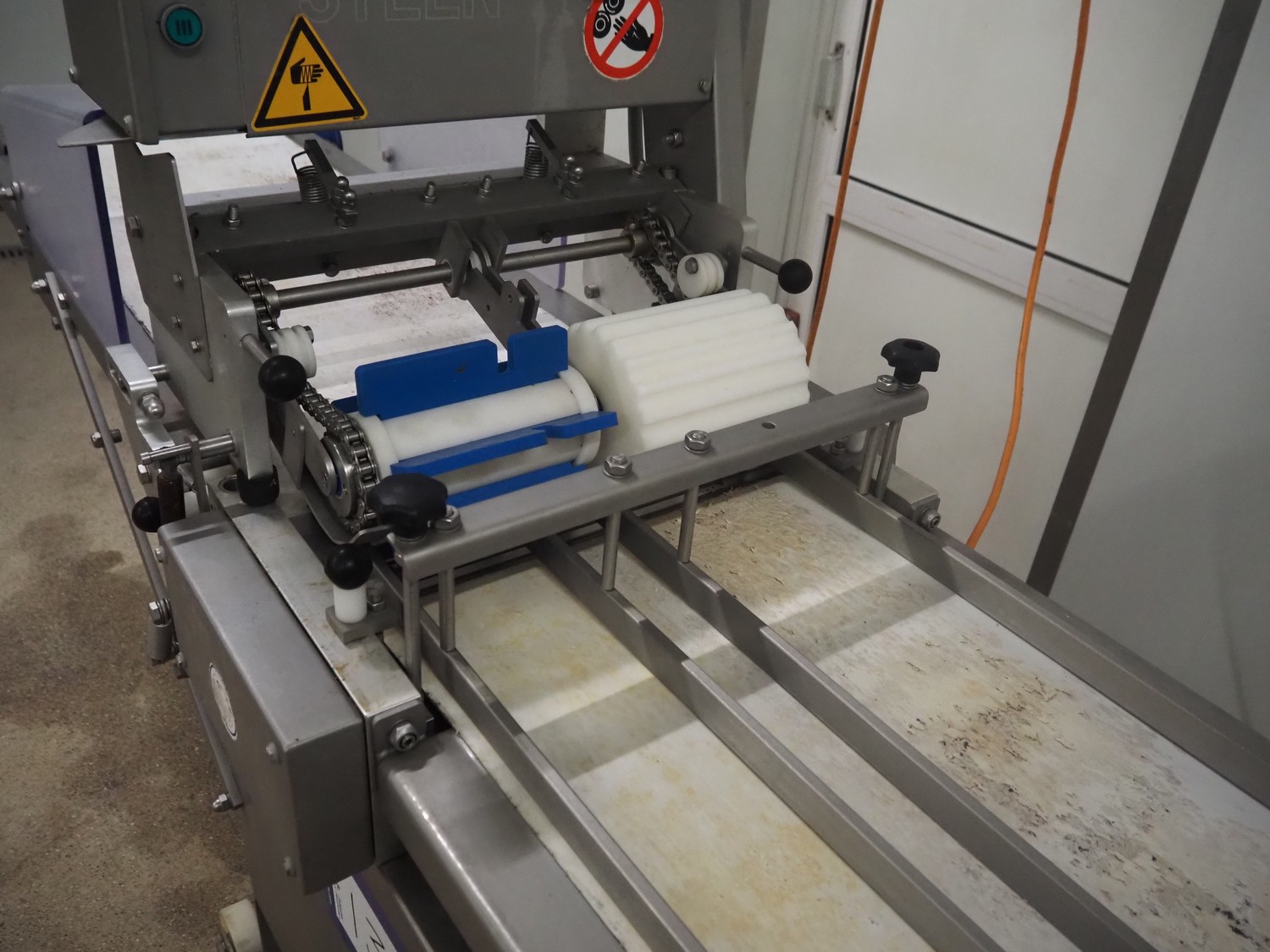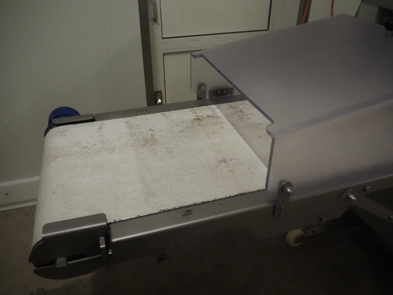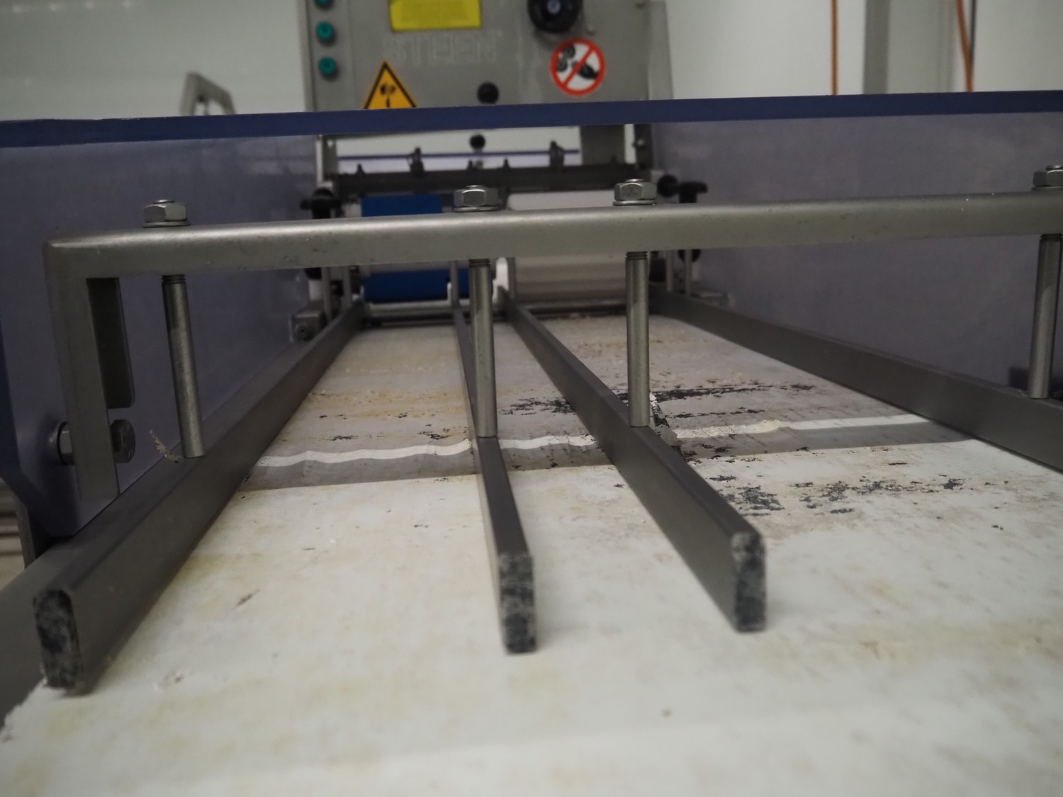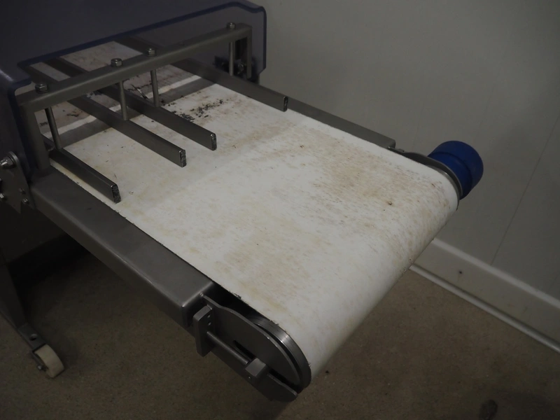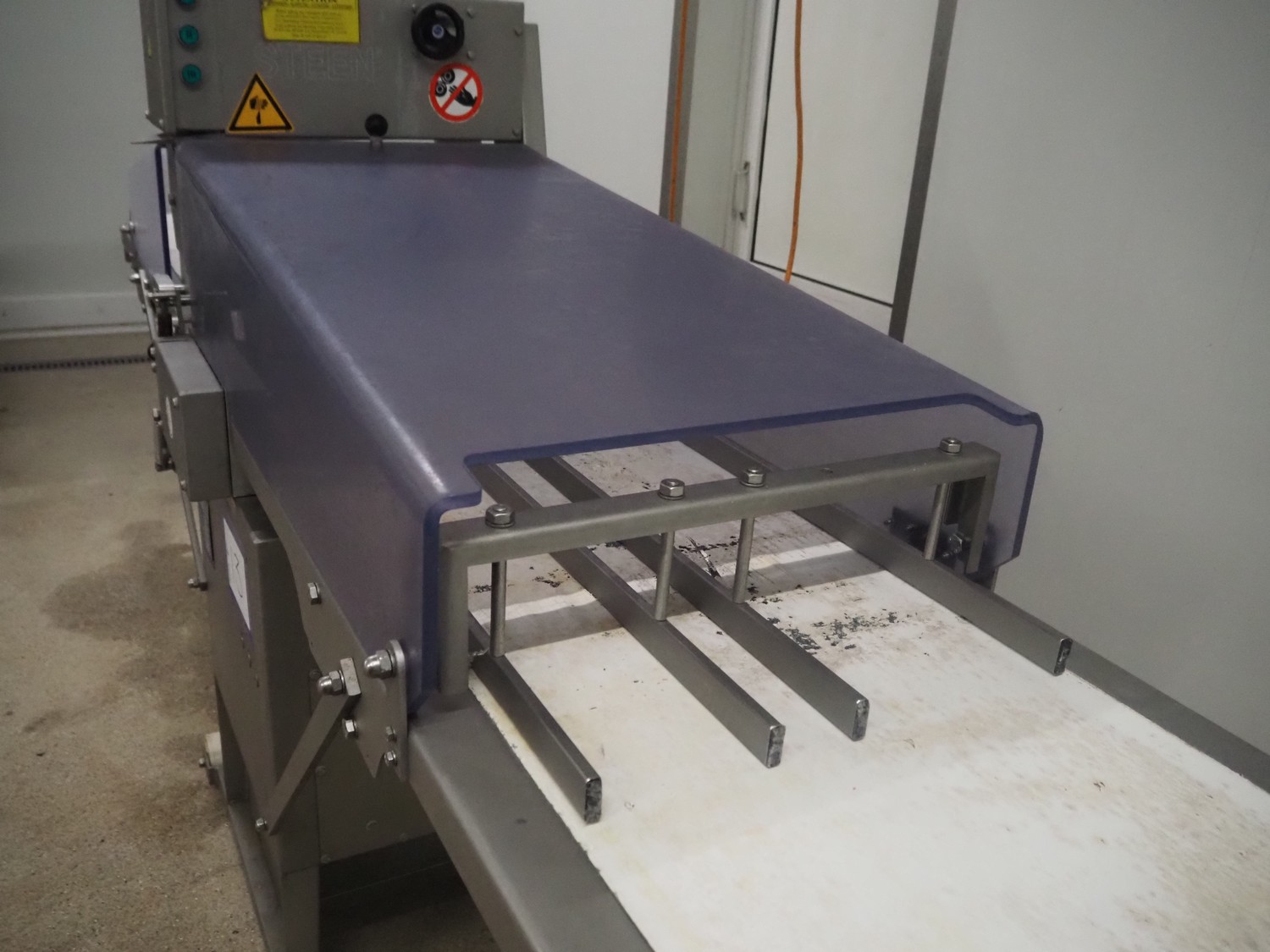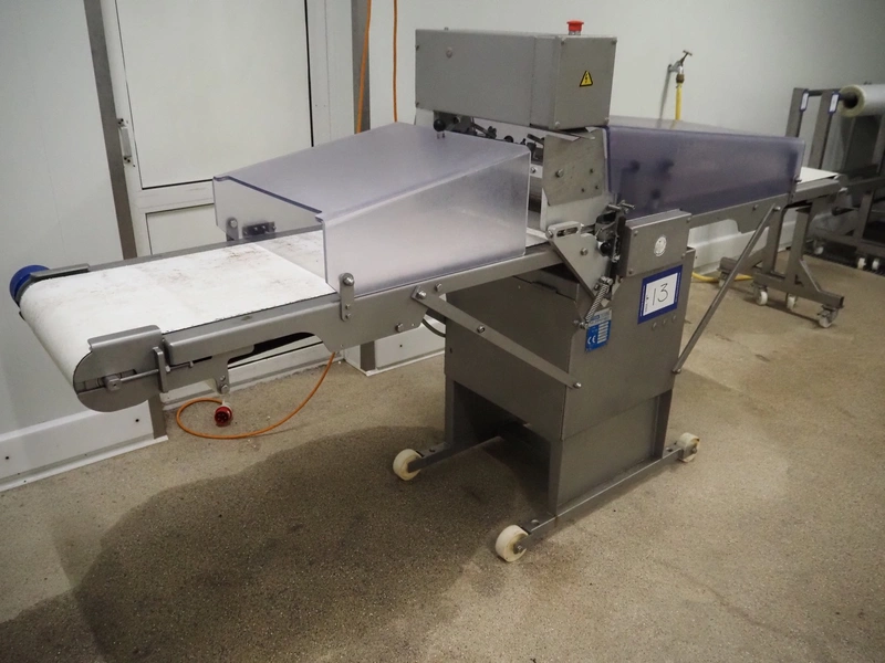 Steen mobile skinning machine, type: ST 600, serial number: 2G8/4503A, 380/480 V, 50-60 Hz, 5.8 A, 1950 W, plastic belt, belt width: 430 mm, working width: 400 mm, total dimensions: 2900 mm x 600 mm x 1500 mm.