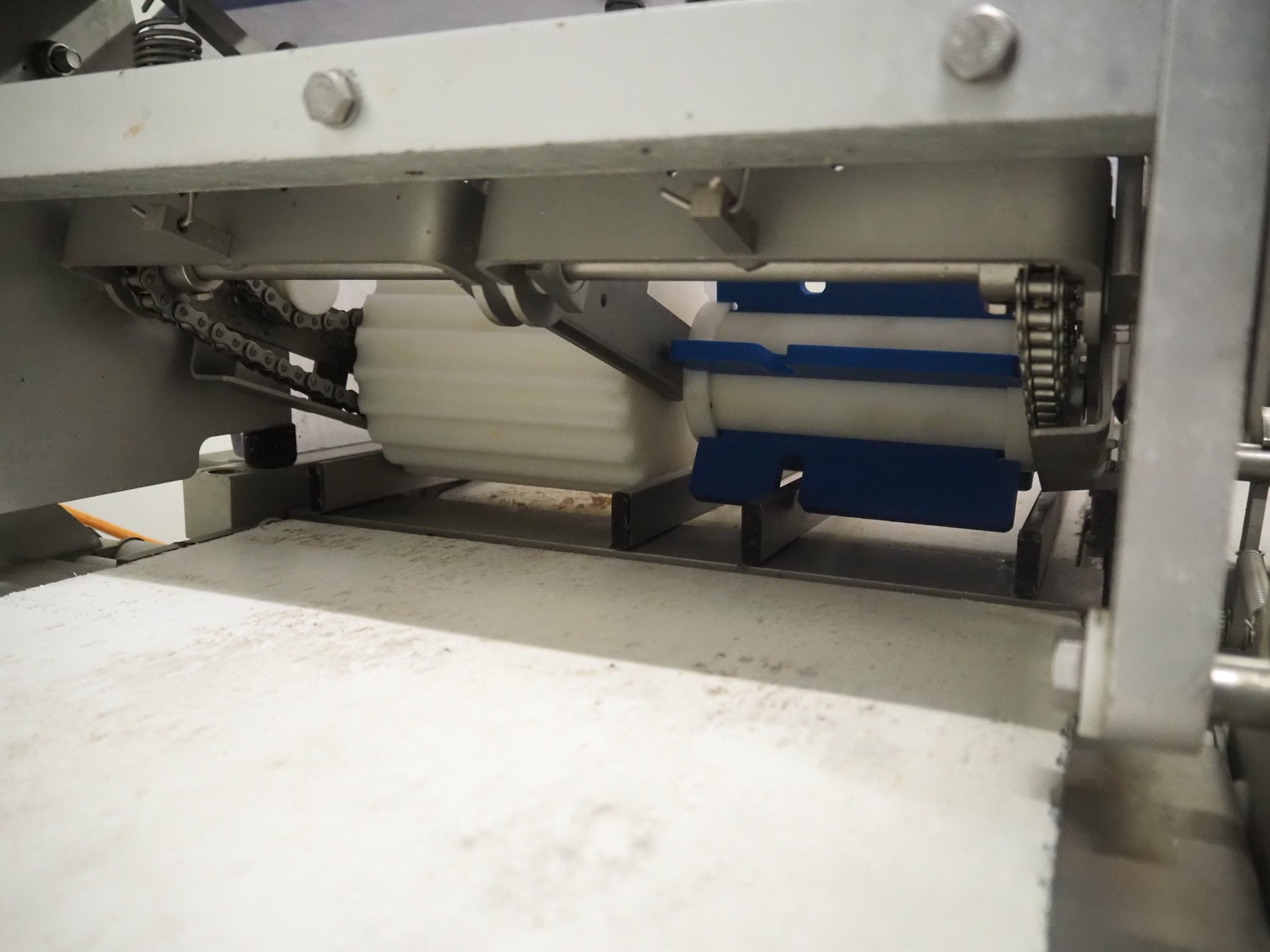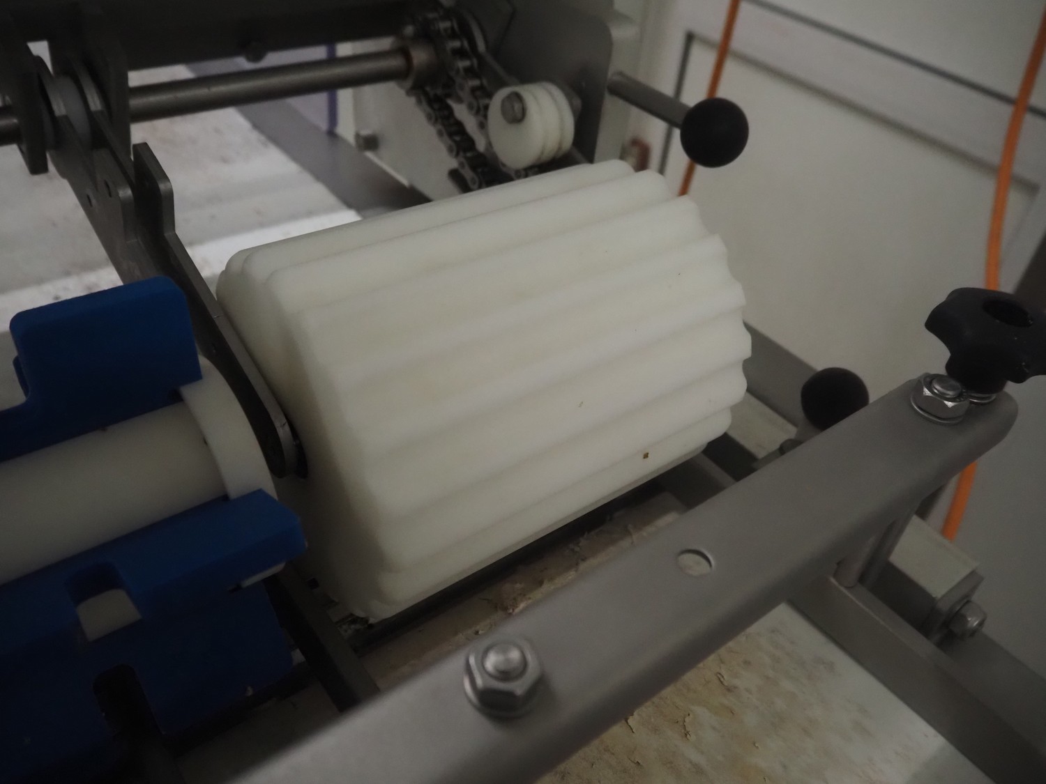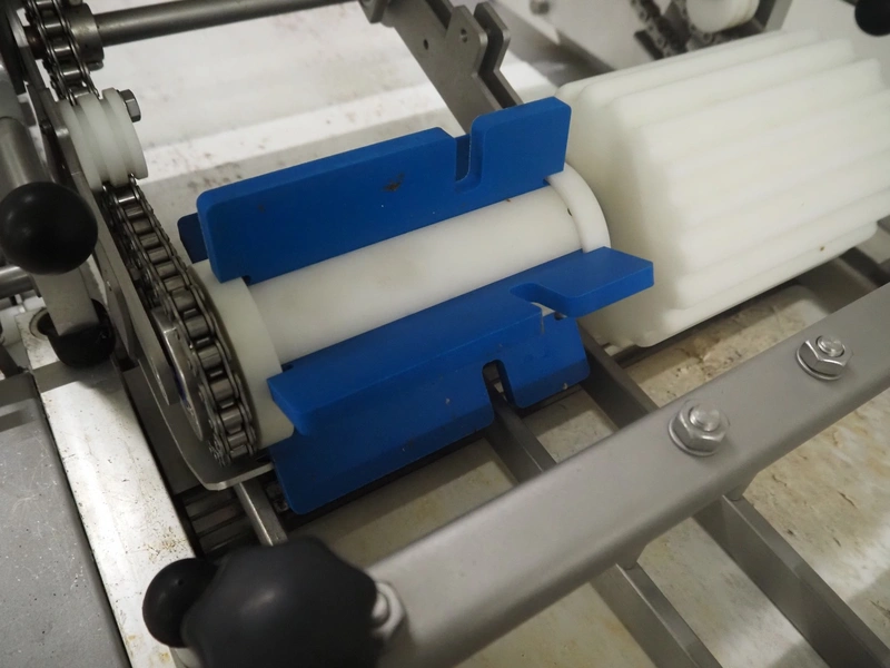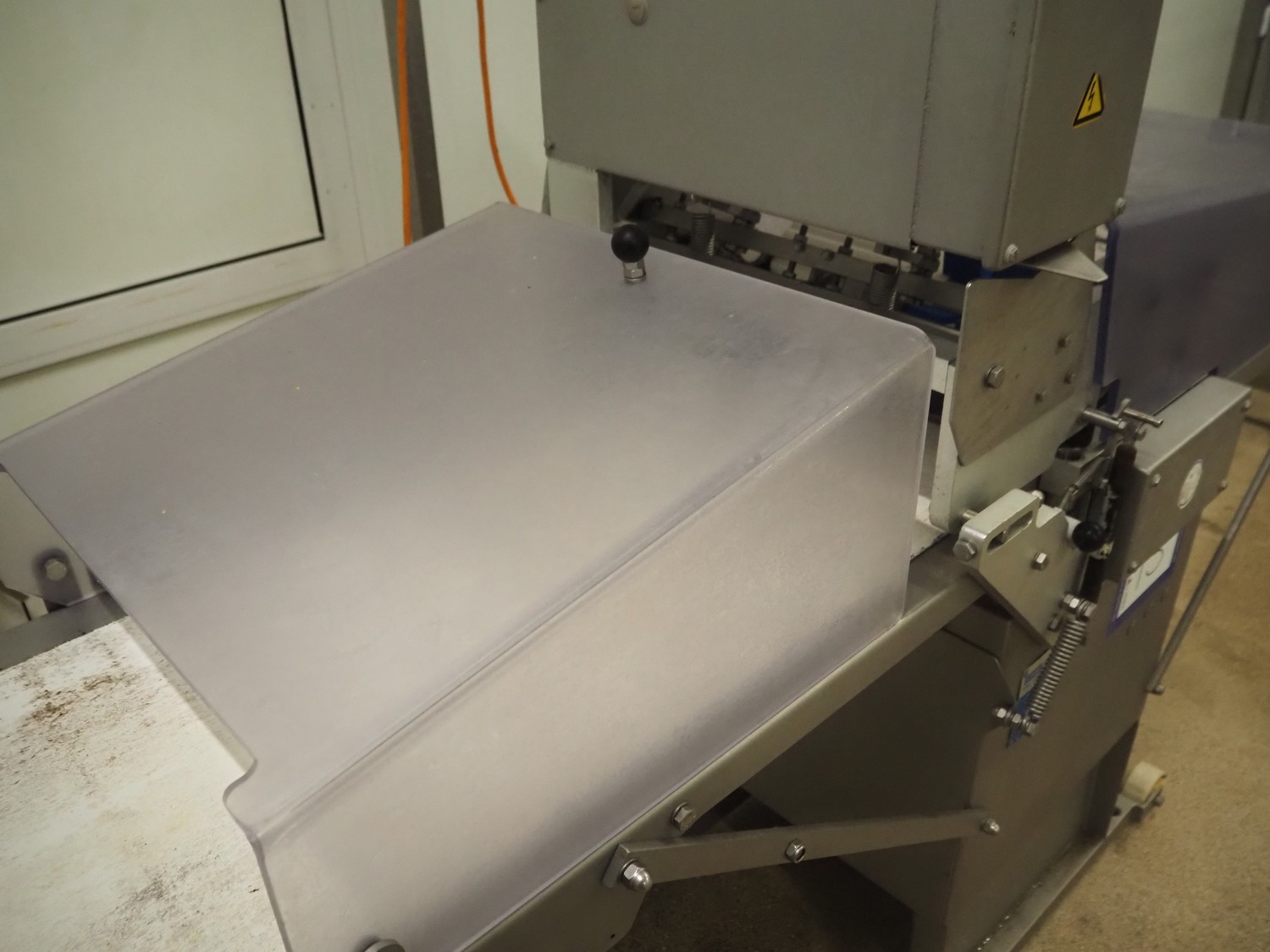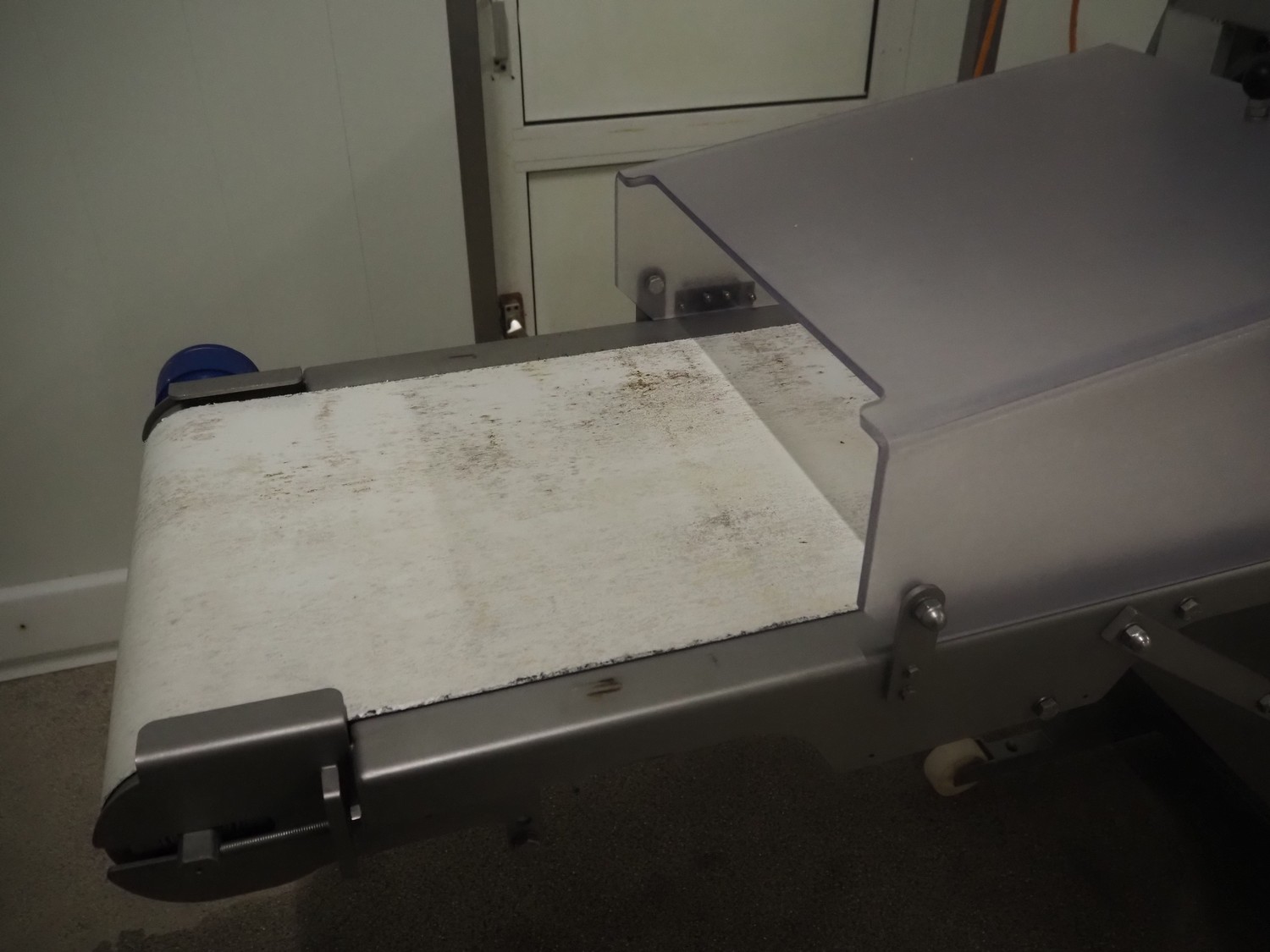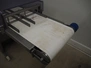 Steen mobile skinning machine, type: ST 600, serial number: 2G8/4503A, 380/480 V, 50-60 Hz, 5.8 A, 1950 W, plastic belt, belt width: 430 mm, working width: 400 mm, total dimensions: 2900 mm x 600 mm x 1500 mm.