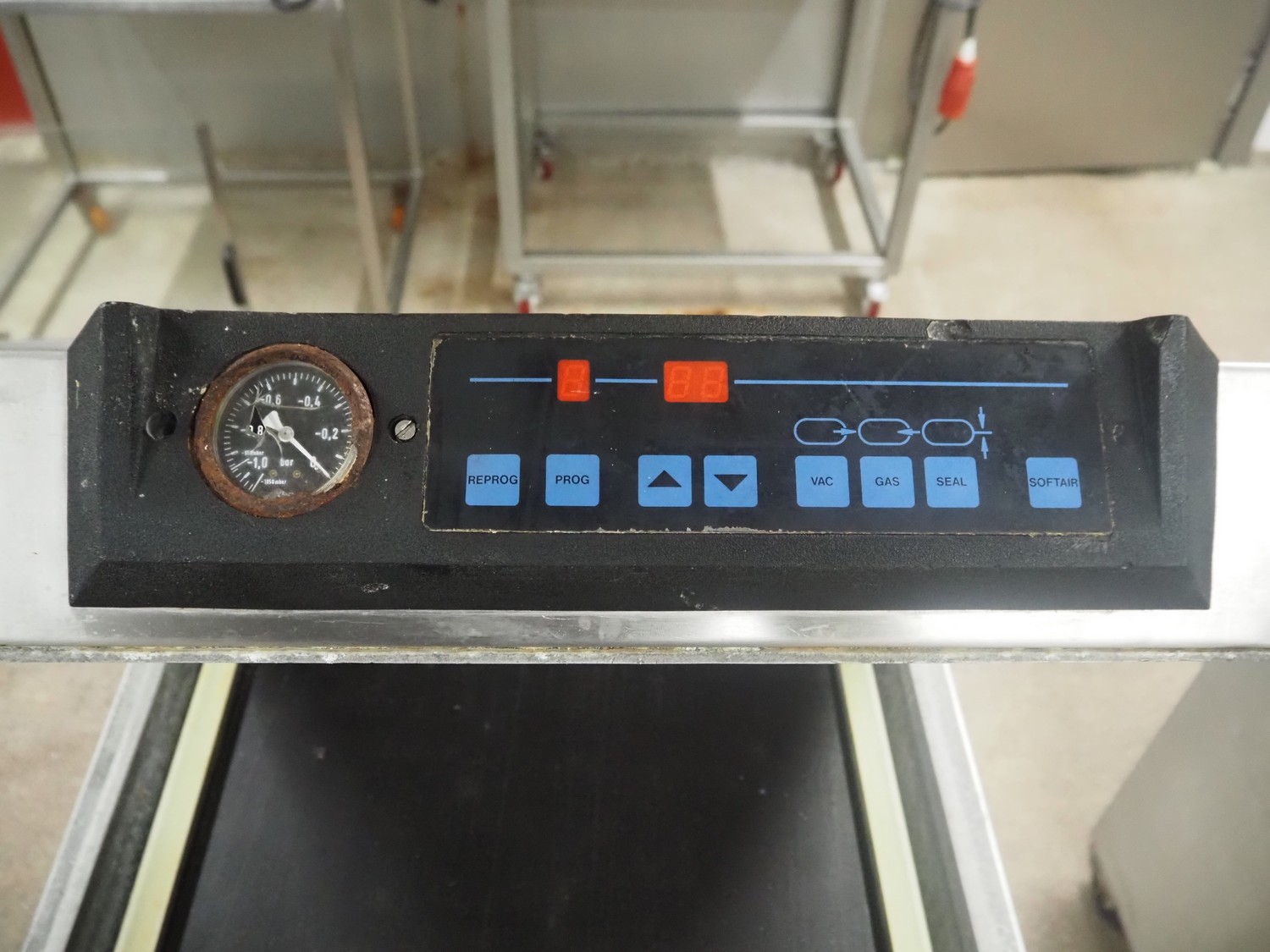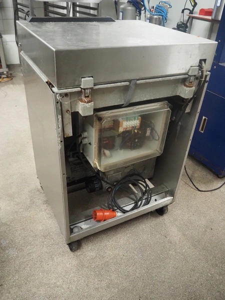 Henkovac mobile vacuum machine, type: 2000, seal length: (2x) 500 mm, dimensions chamber: 500 mm x 500 mm, Busch vacuum pump, type: 063-122, number: 415101, capacity: 63 m³ per hour, total dimensions: 680 mm x 580 mm x 1050 mm.