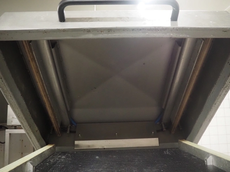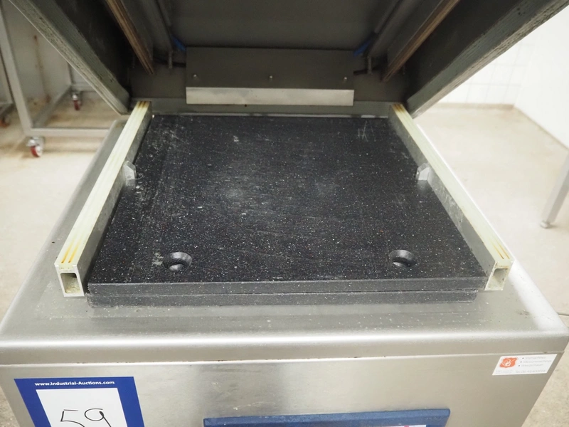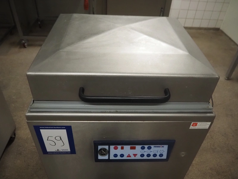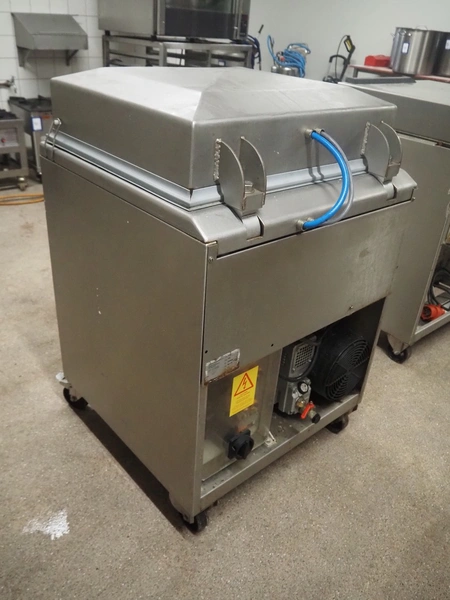 Henkovac mobile vacuum machine, type: E-202, number: 209068963, year of construction: 1998, 400 V, 3 Ph, 50 Hz, 9.4 A, 3.3 kW, seal length: (2x) 560 mm, dimensions chamber: 510 mm x 530 mm, Busch vacuum pump, total dimensions: 740 mm x 700 mm x 1100 mm.