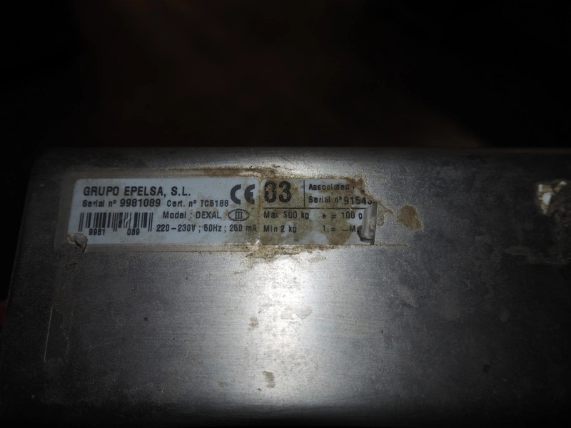 Grupo Epelsa S.L. mobile weighing scale, model: DEXAL, serial number: 9981089, 220-230 V, 50 Hz, maximum weight: 500 kg, minimum weight: 2 kg, dimensions scale: 610 mm x 455 mm, total dimensions: 610 mm x 610 mm x 1650 mm.