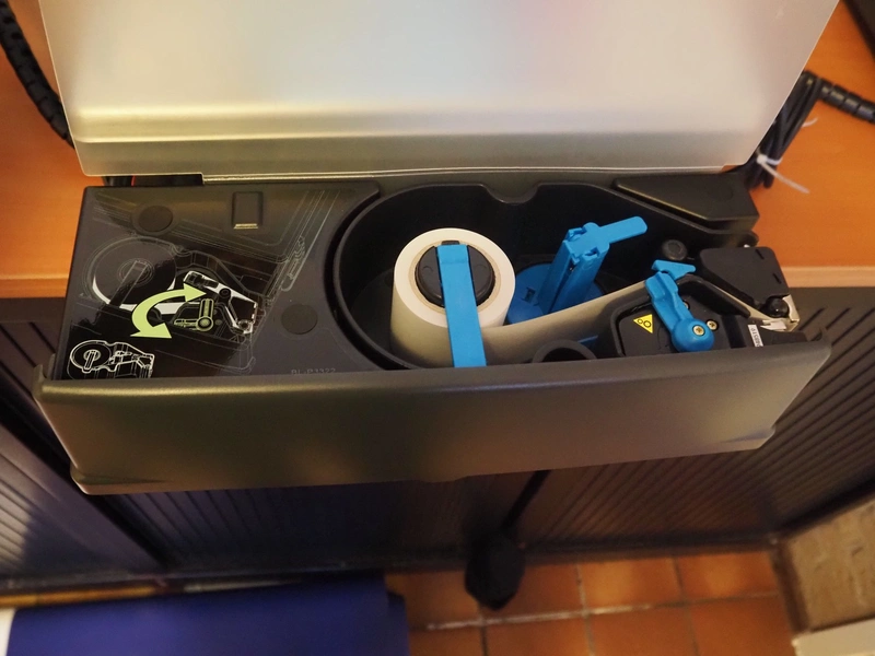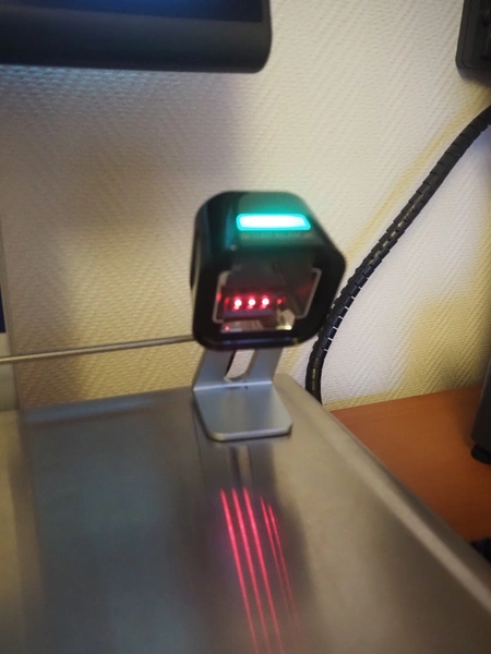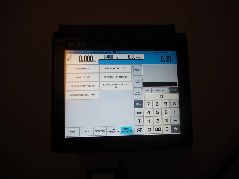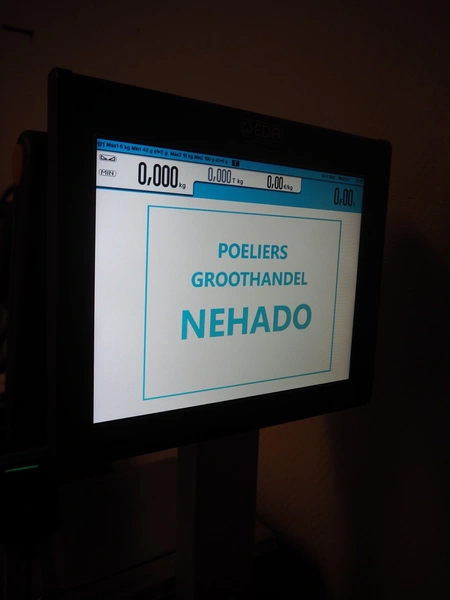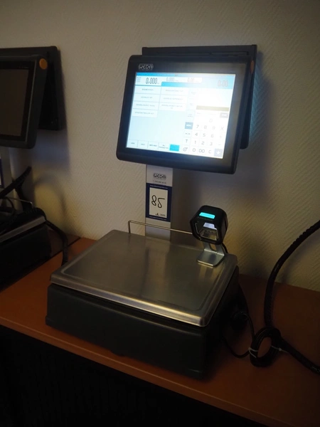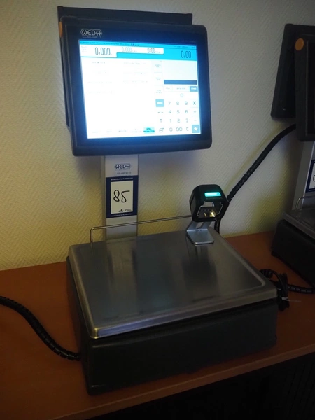 Dibal S.A. weighing scale with label printer and scanner, model: D-900 series, serial number: 31948519, 110-230 V, 50/60 Hz, 1.2 A, maximum weight: 15 kg, minimum weight: 100 gram, e= 5 gram, T= -14.995 kg, dimensions scale: 360 mm x 280 mm, total dimensions: 380 mm x 460 mm x 620 mm.