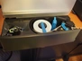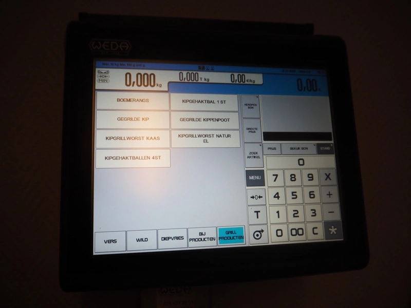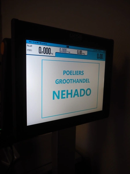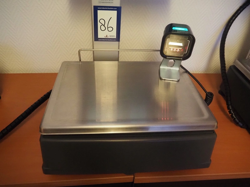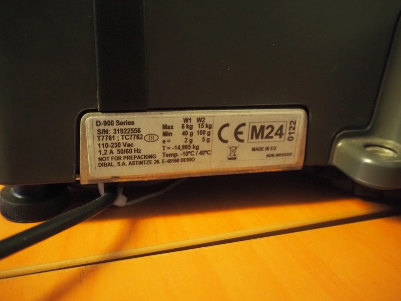Dibal S.A. weighing scale with label printer and scanner, model: D-900 series, serial number: 31922556, 110-230 V, 50/60 Hz, 1.2 A, maximum weight: 15 kg, minimum weight: 100 gram, e= 5 gram, T= -14.995 kg, dimensions scale: 360 mm x 280 mm, total dimensions: 380 mm x 460 mm x 620 mm.
