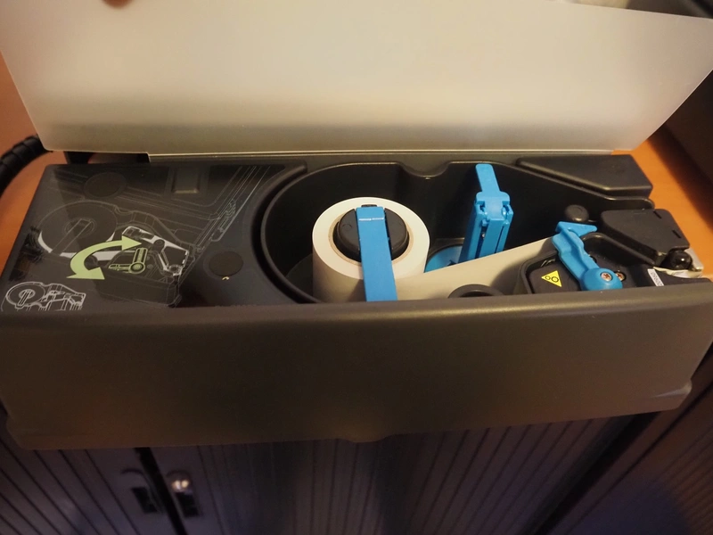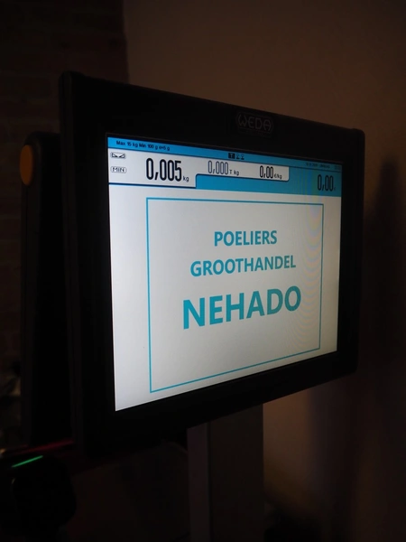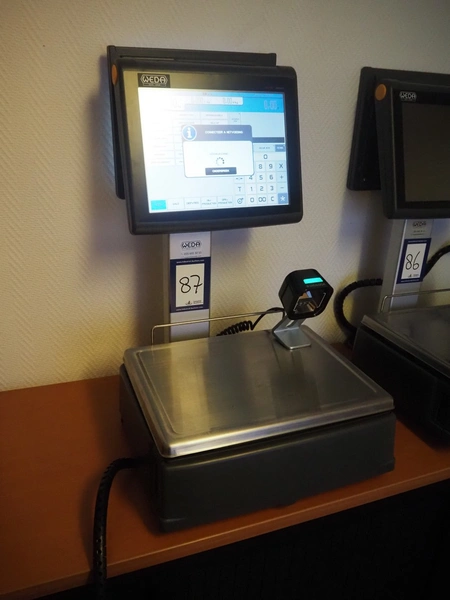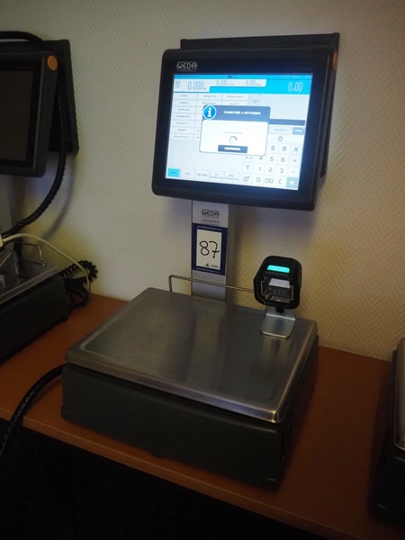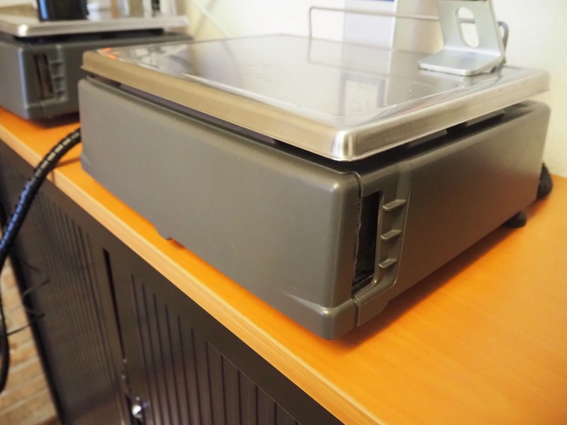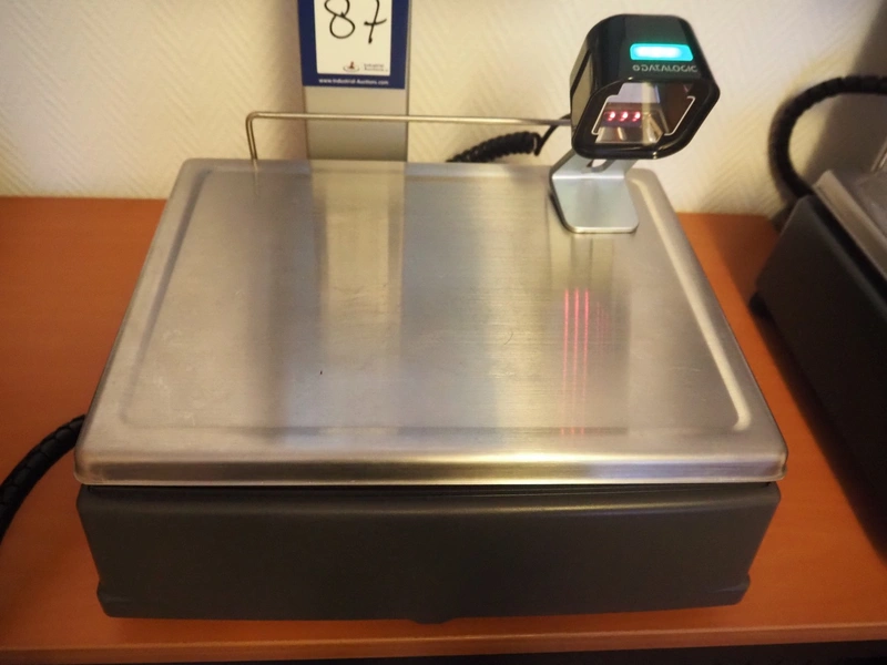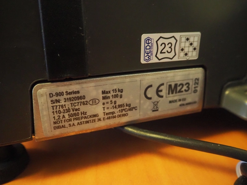 Dibal S.A. weighing scale with label printer and scanner, model: D-900 series, serial number: 31920960, 110-230 V, 50/60 Hz, 1.2 A, maximum weight: 15 kg, minimum weight: 100 gram, e= 5 gram, T= -14.995 kg, dimensions scale: 360 mm x 280 mm, total dimensions: 380 mm x 460 mm x 620 mm.